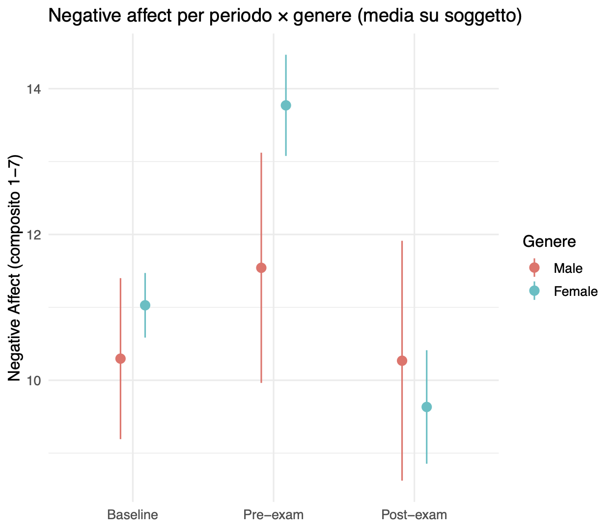 - Descrizione dei dati: osservare l’andamento del negative affect nei tre periodi di rilevazione (baseline, pre-esame, post-esame) e le differenze di genere a livello descrittivo.