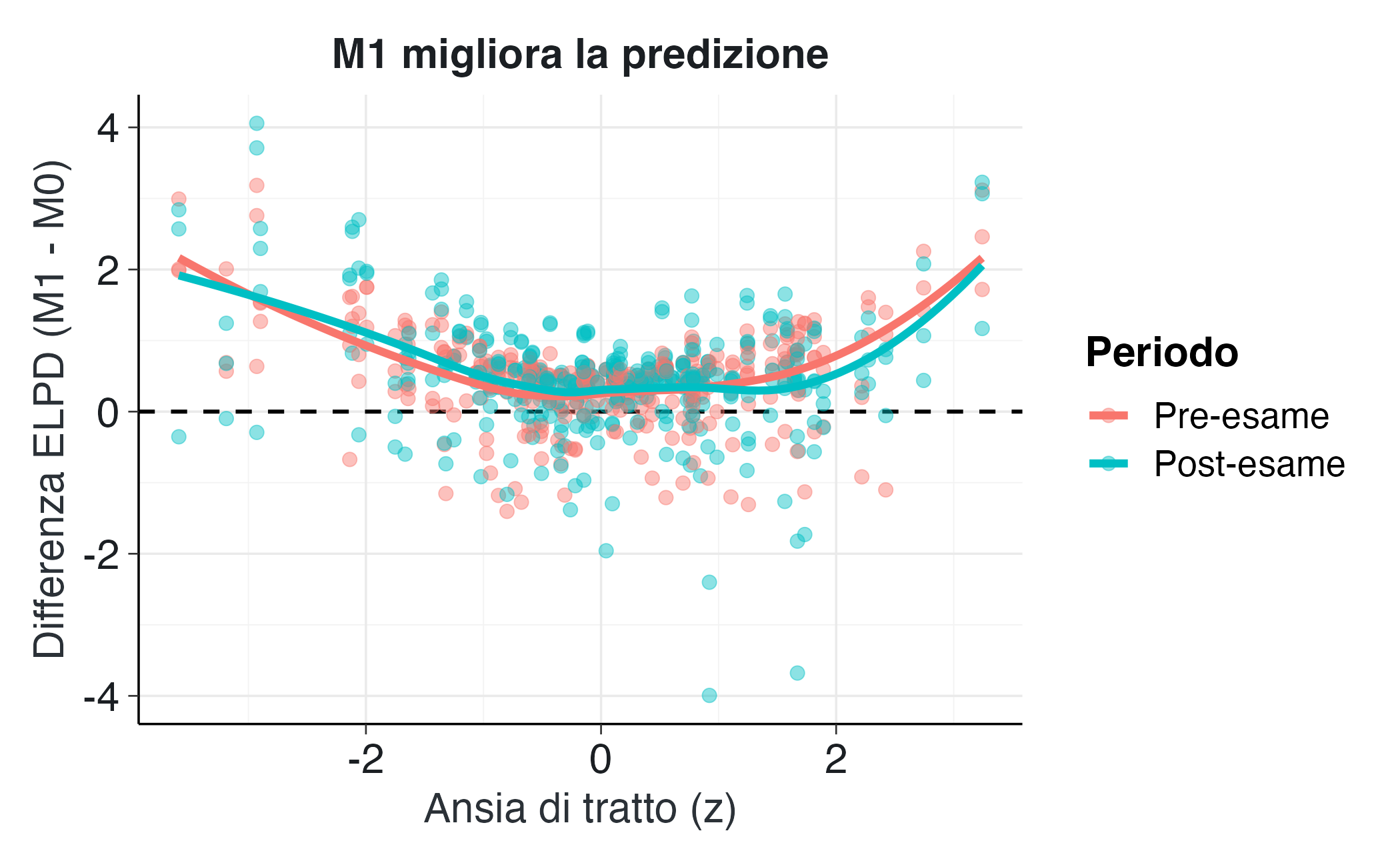 Il primo modello (M0) include solo gli effetti principali di post e trait_z e un’intercetta casuale per studente. Il secondo modello (M1) aggiunge l’interazione Post × Trait e consente un effetto casuale sulle pendenze per la variabile post.