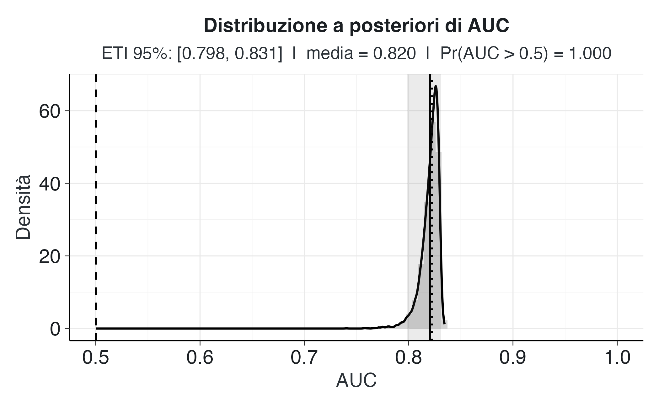 L’AUC così calcolata è una stima “in-sample”, cioè misurata sugli stessi dati usati per adattare il modello. È quindi analoga all’AUC “ottimistica” del modello frequentista, con la differenza fondamentale che l’approccio bayesiano non fornisce una stima puntuale, ma una distribuzione di credibilità che quantifica esplicitamente l’incertezza.