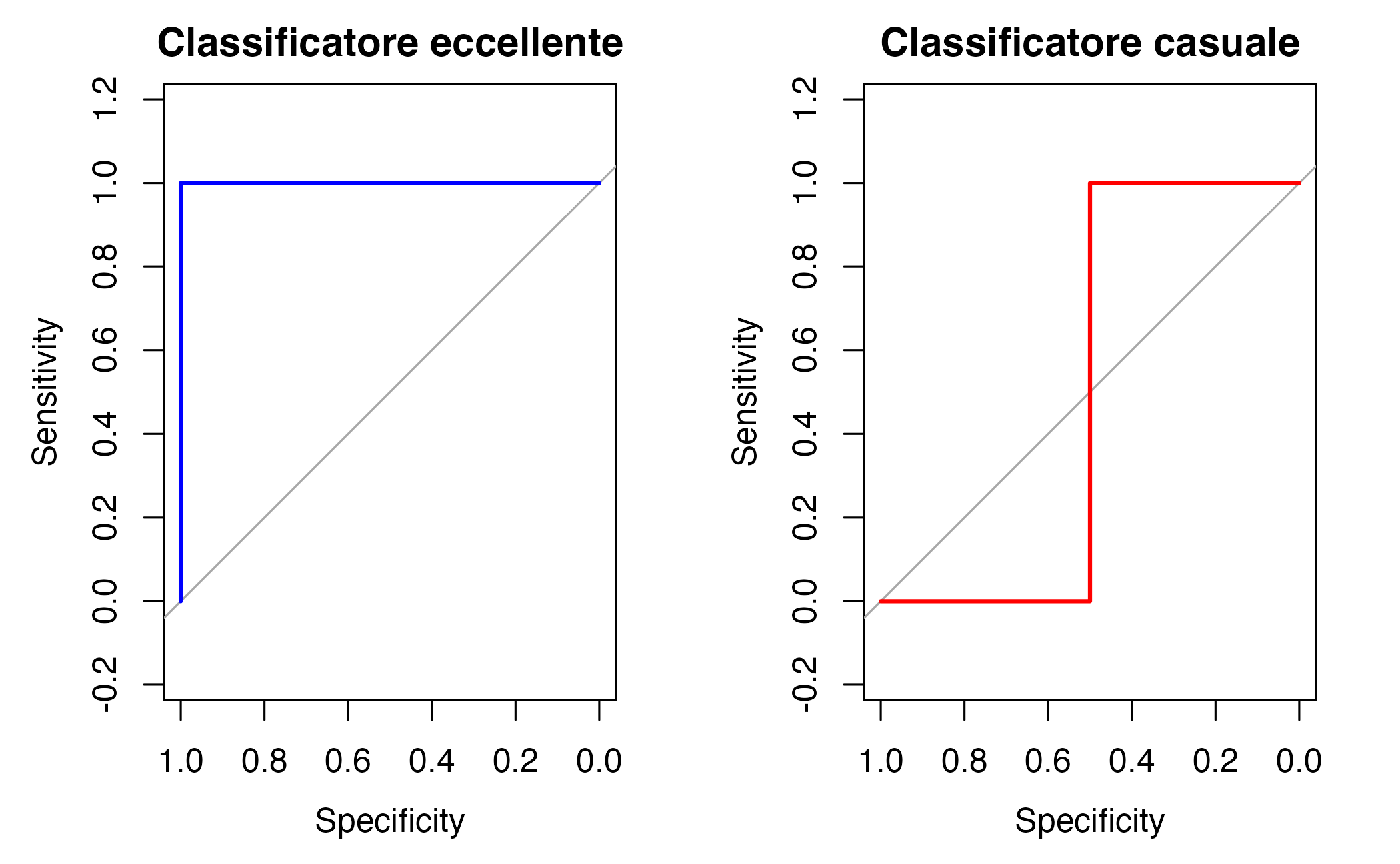 main = "Classificatore casuale", col = "red")Cosa osserviamo: