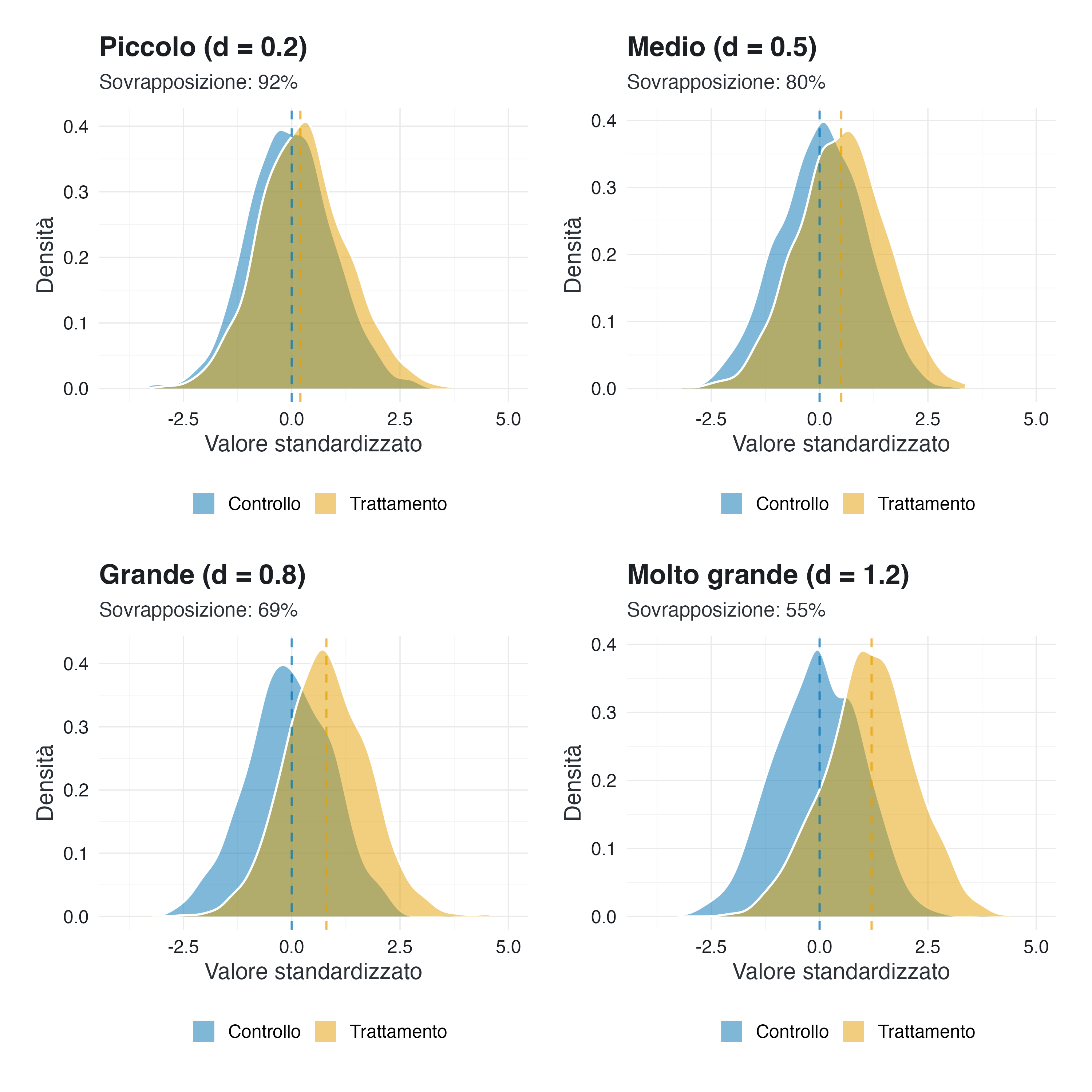 Intuizione immediata: mentre “d = 0.5” può risultare astratto, affermare che “il 64% degli individui del gruppo trattamento supera il gruppo controllo” fornisce un’immagine concreta della differenza tra i gruppi.