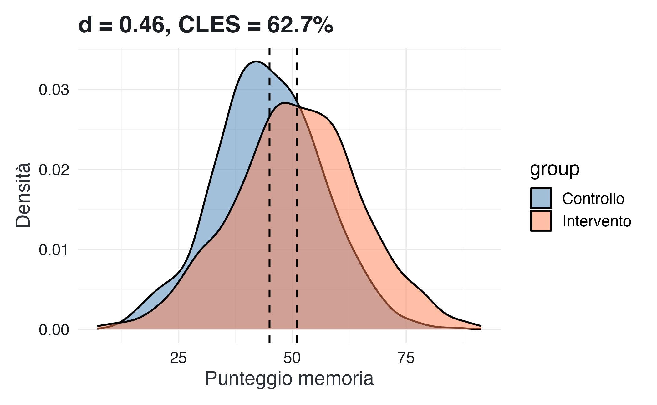 Un \(d = 0.5\) significa che le medie dei due gruppi differiscono di mezza deviazione standard. Ma cosa significa concretamente?