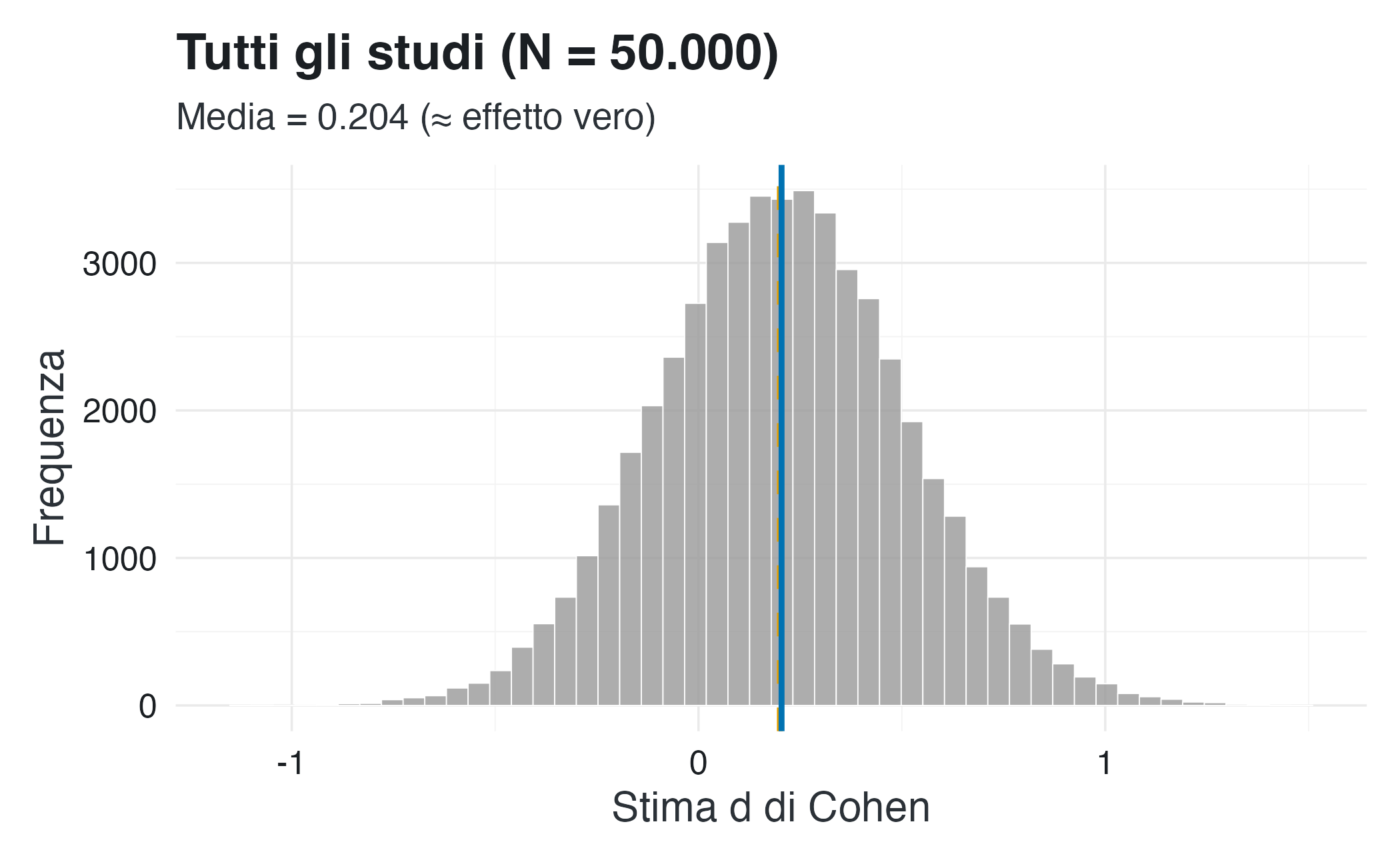 La prima figura include soltanto gli studi che superano la soglia di significatività. In questo sottoinsieme, la distribuzione delle stime dell’indice d di Cohen risulta nettamente spostata verso valori più elevati rispetto all’effetto reale: