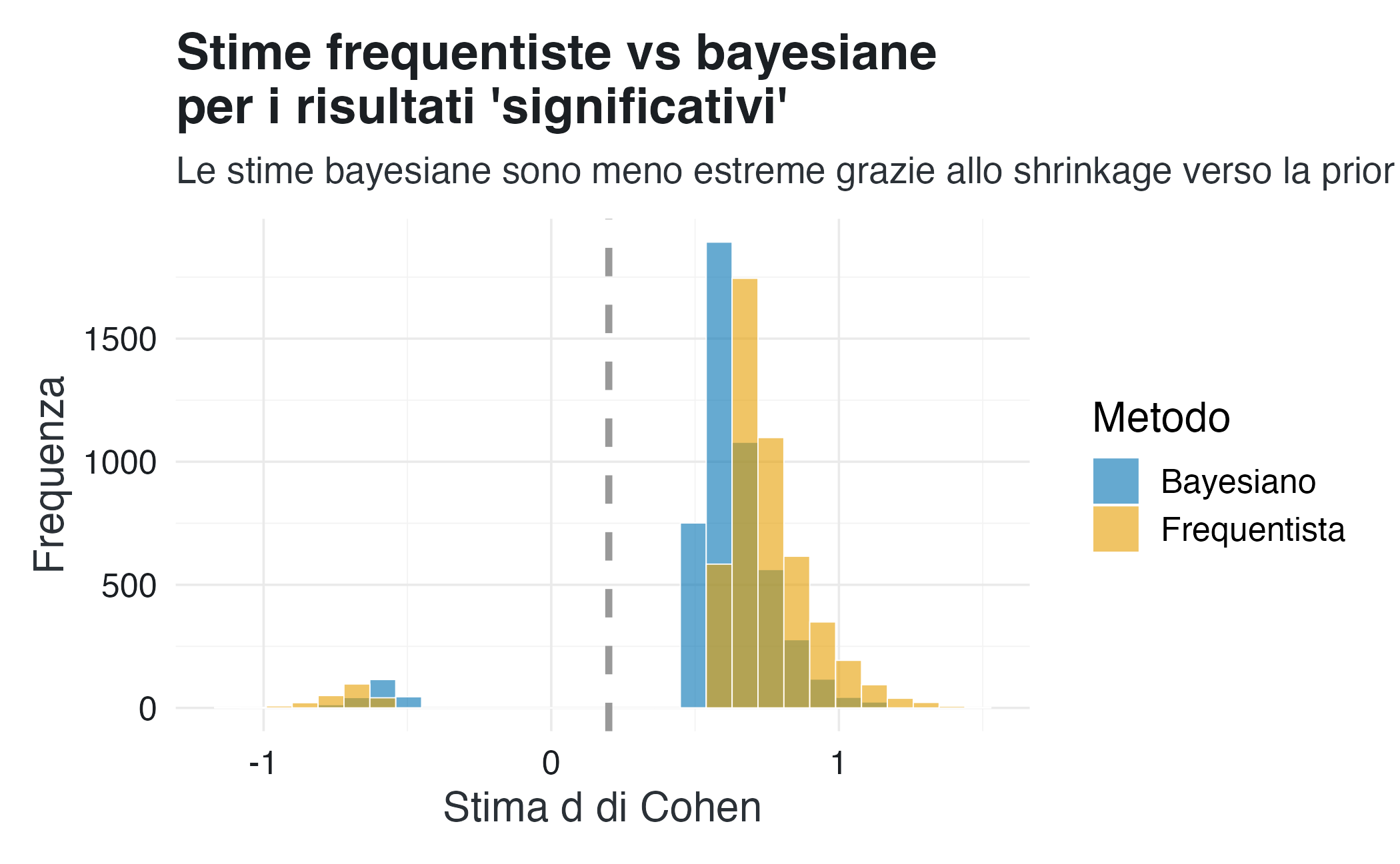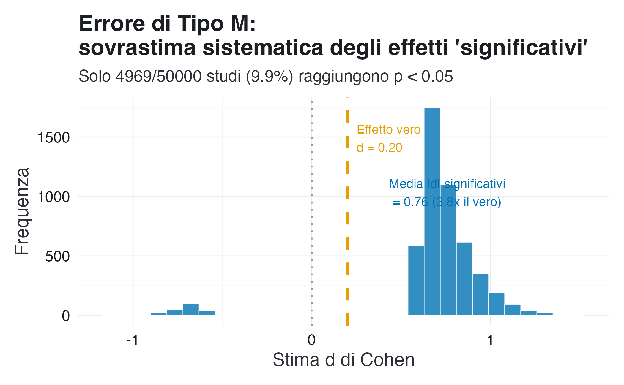 - Errore di tipo M (Magnitude): La media degli effetti stimati nei risultati pubblicati sarà molto più grande di 0.2 (il vero effetto), dimostrando come il filtro della significatività tenda a sovrastimare gli effetti reali.
