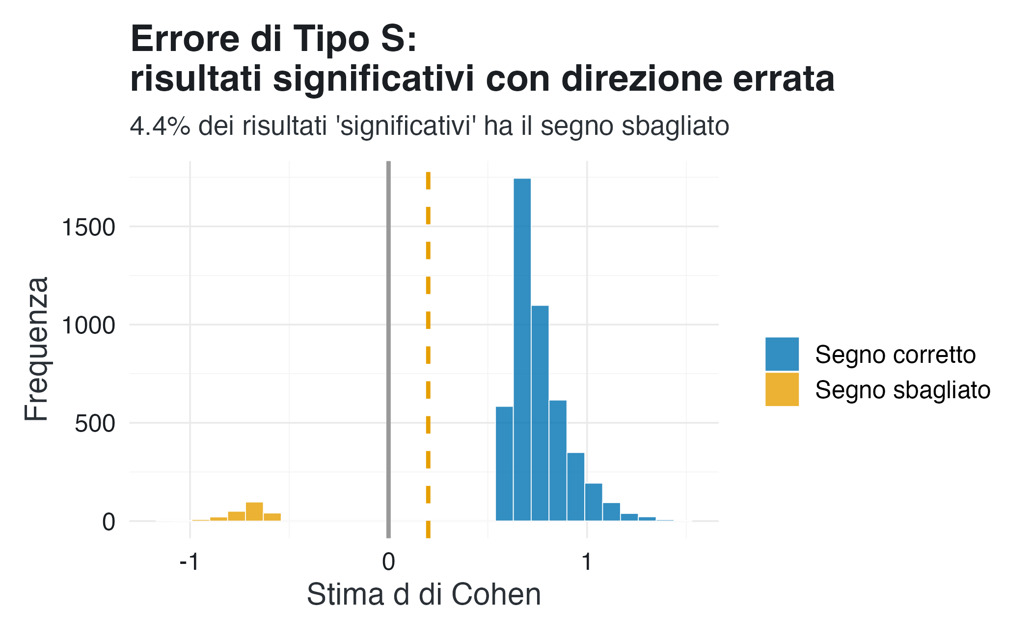 - Errore di tipo S (Sign): Una percentuale dei risultati pubblicabili mostrerà effetti nella direzione sbagliata (d < 0), dimostrando che il processo decisionale basato su p < 0.05 può portare a conclusioni errate.
