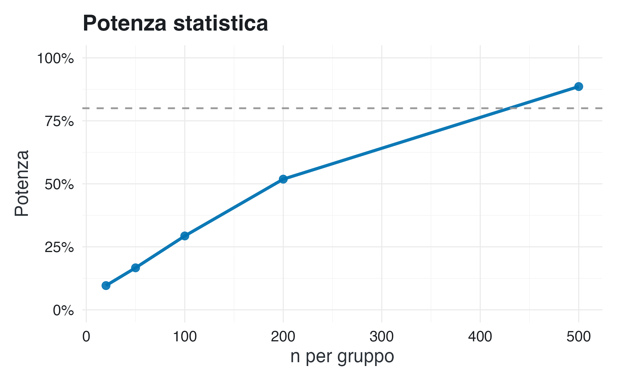 cat(sprintf("Questo significa che ~%.0f%% degli studi troverà p < 0.05\n", power * 100))