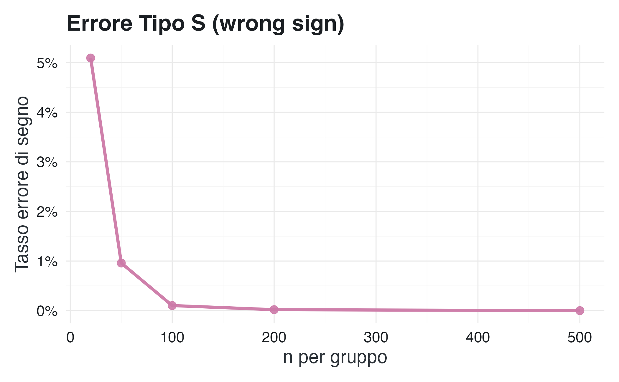 - errore di segno (Type S): una piccola ma non trascurabile percentuale di effetti statisticamente significativi presenta il segno opposto rispetto all’effetto reale.