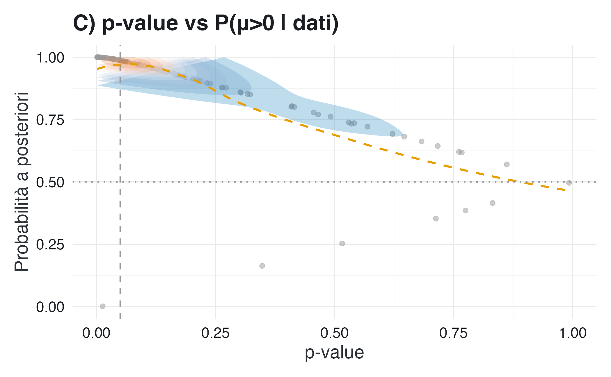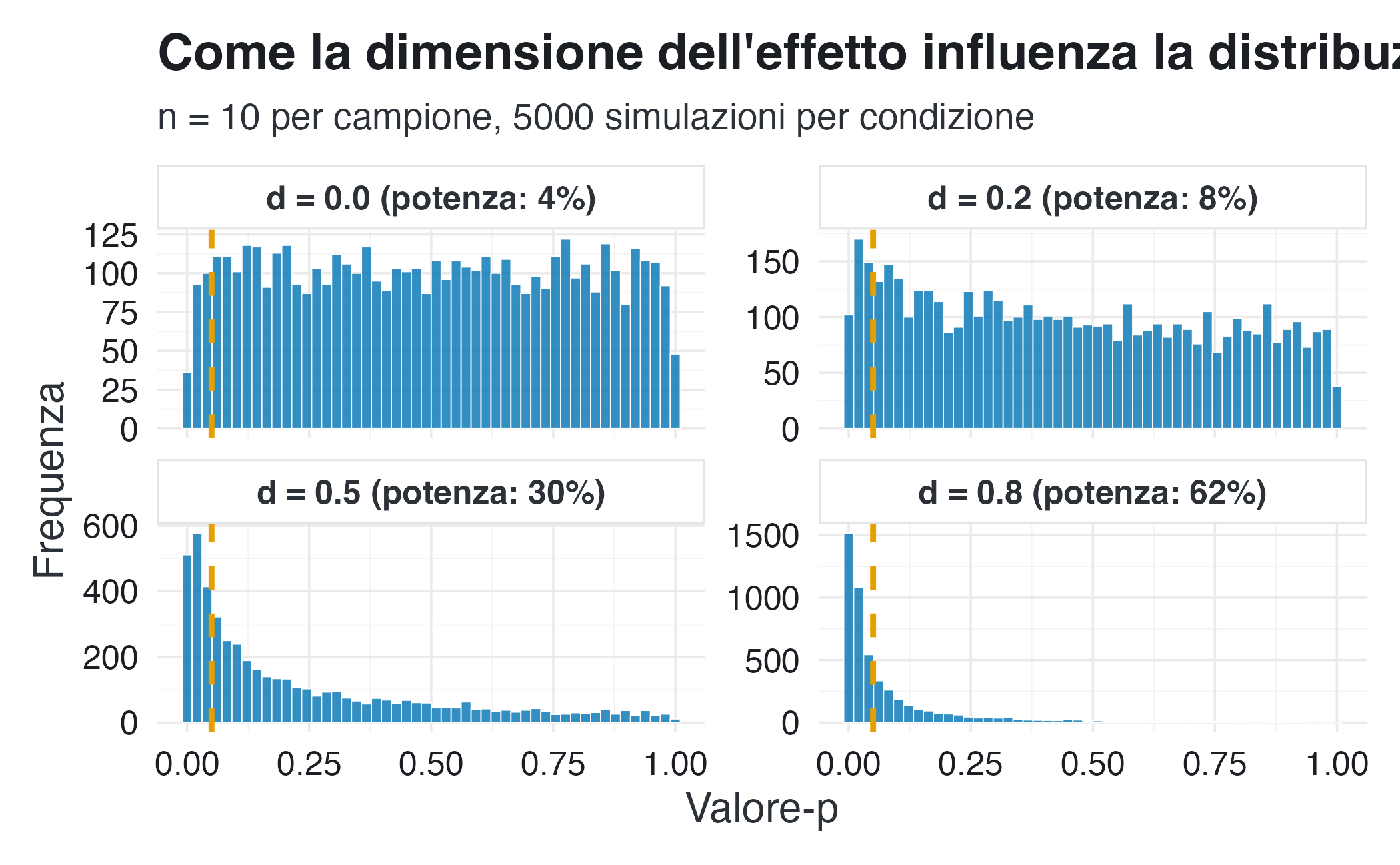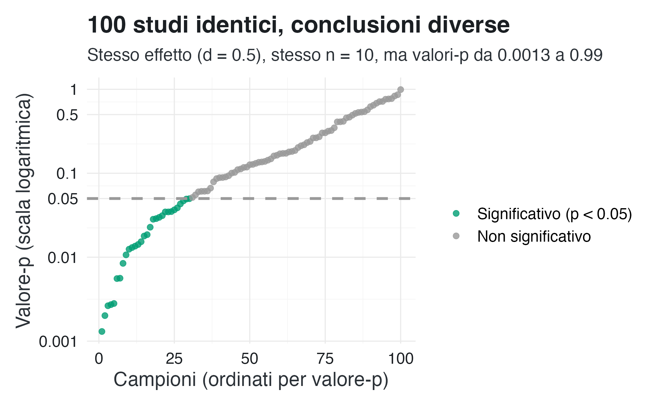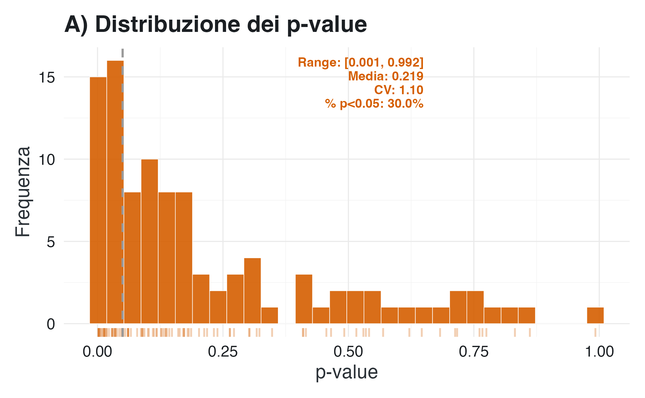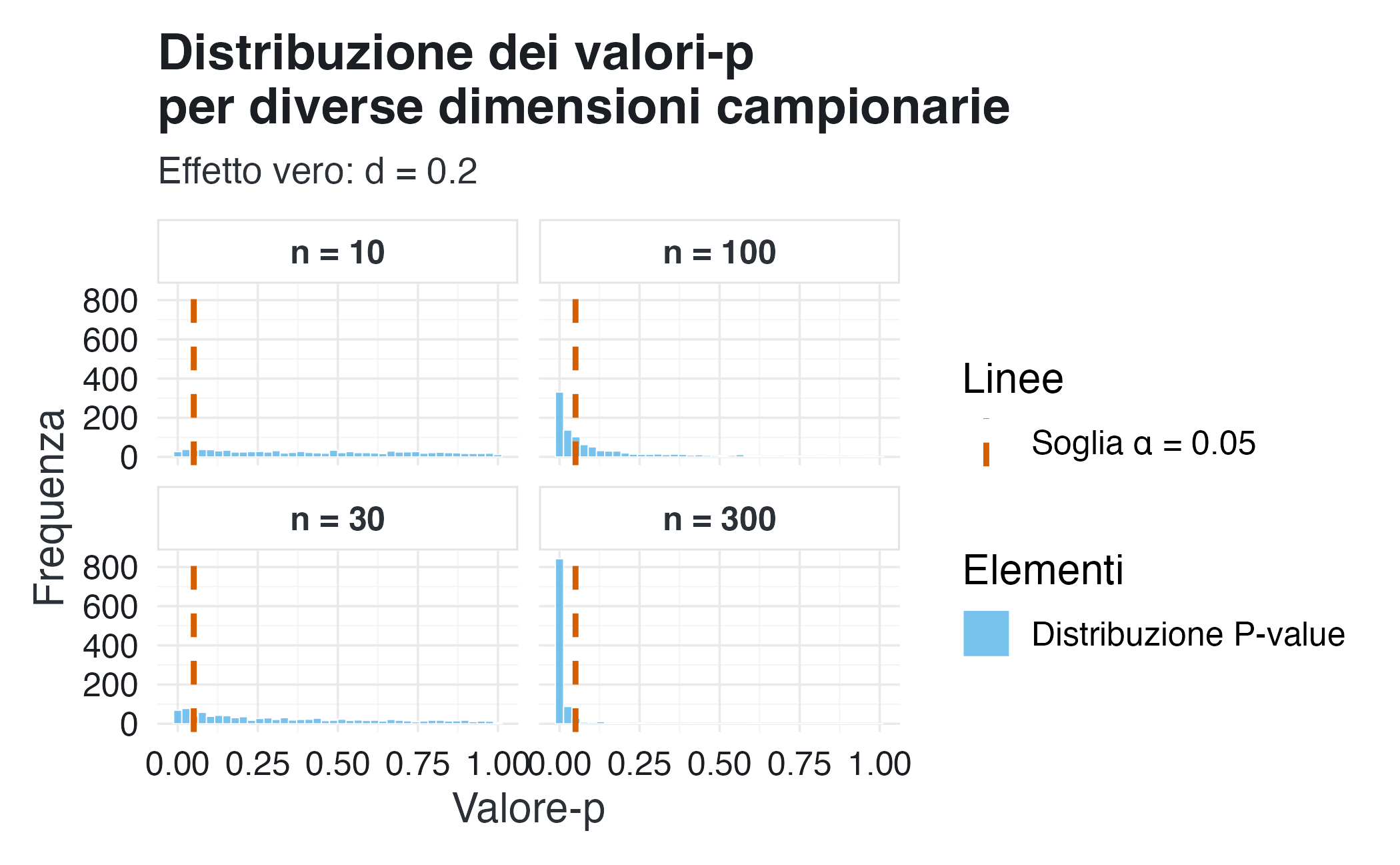 )Il grafico mette in evidenza un risultato particolarmente incisivo: lo stesso effetto reale, valutato con la medesima procedura statistica (test \(t\) di Student), può generare valori-\(p\) che coprono pressoché l’intera gamma possibile, da valori prossimi a 0 fino a valori prossimi a 1. In pratica, estraendo campioni diversi dalla stessa popolazione, si giungerebbe a conclusioni diametralmente opposte: con alcuni si dichiarerebbe l’effetto “altamente significativo” (\(p\) < 0.01), mentre con altri non si rileverebbe alcuna evidenza statistica (\(p\) > 0.05). Tale variabilità non riflette differenze nel fenomeno sottostante, ma è esclusivamente un riflesso della fluttuazione casuale intrinseca al processo di campionamento.