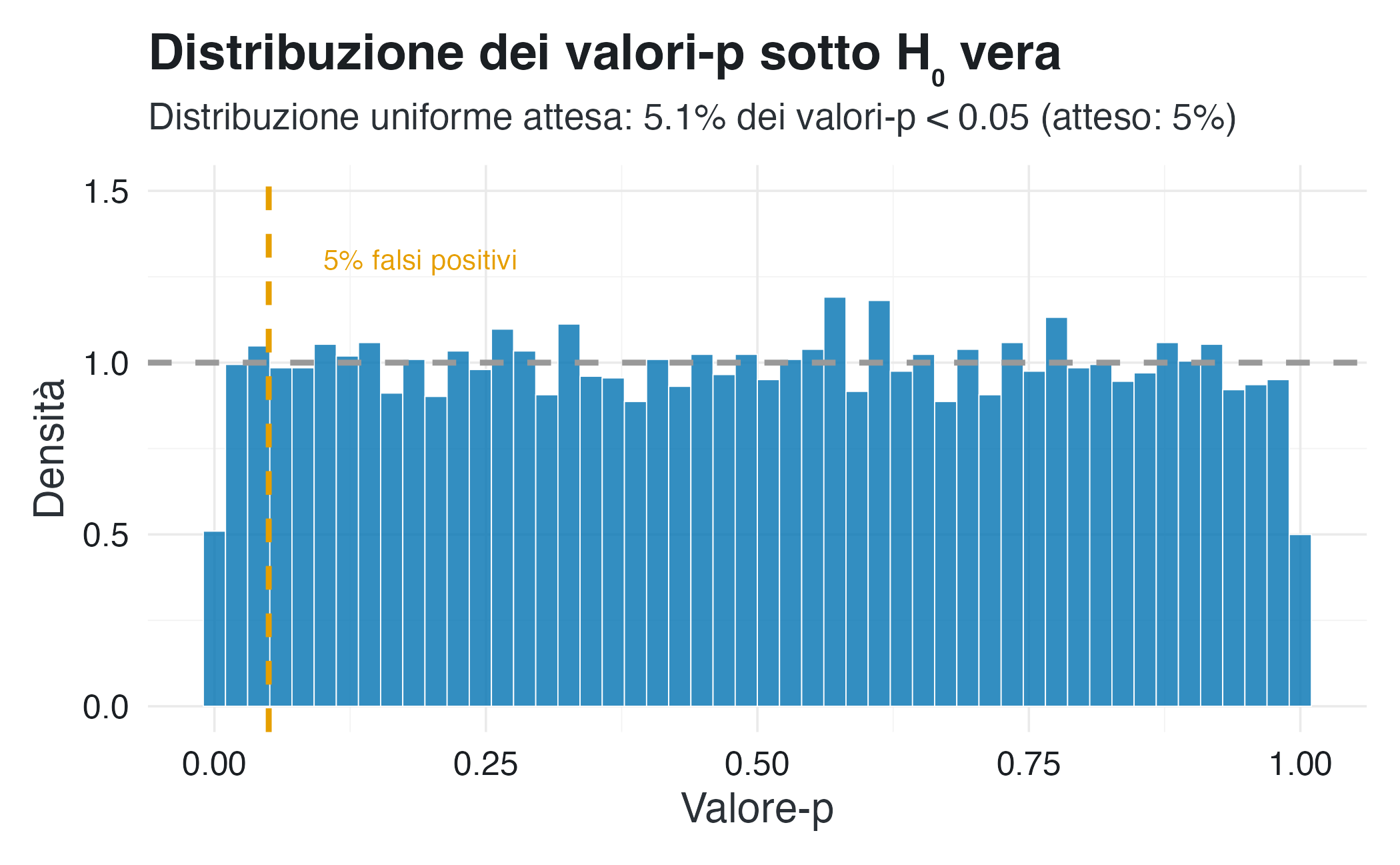 Quando l’ipotesi nulla è vera, il valore-\(p\) è progettato per comportarsi in un modo molto specifico: la sua distribuzione deve essere uniforme tra 0 e 1. In pratica, ciò significa che il 5% dei valori-\(p\) sarà inferiore a 0.05 per puro caso: questo è esattamente il tasso di falsi positivi che il livello di significatività \(\alpha\) intende controllare.