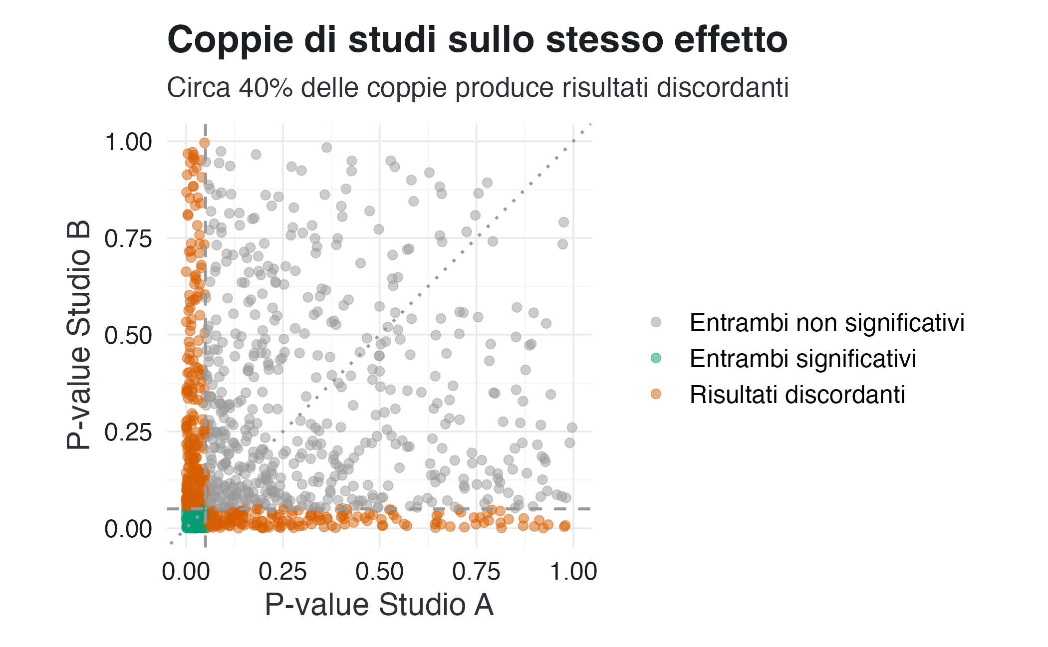 Interpretazione: Abbassare la soglia riduce i falsi positivi ma anche la potenza. La discordanza tra studi rimane alta perché il problema è la variabilità del p-value, non la soglia scelta.
