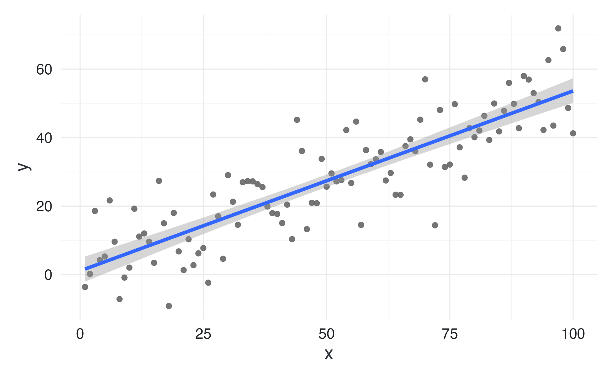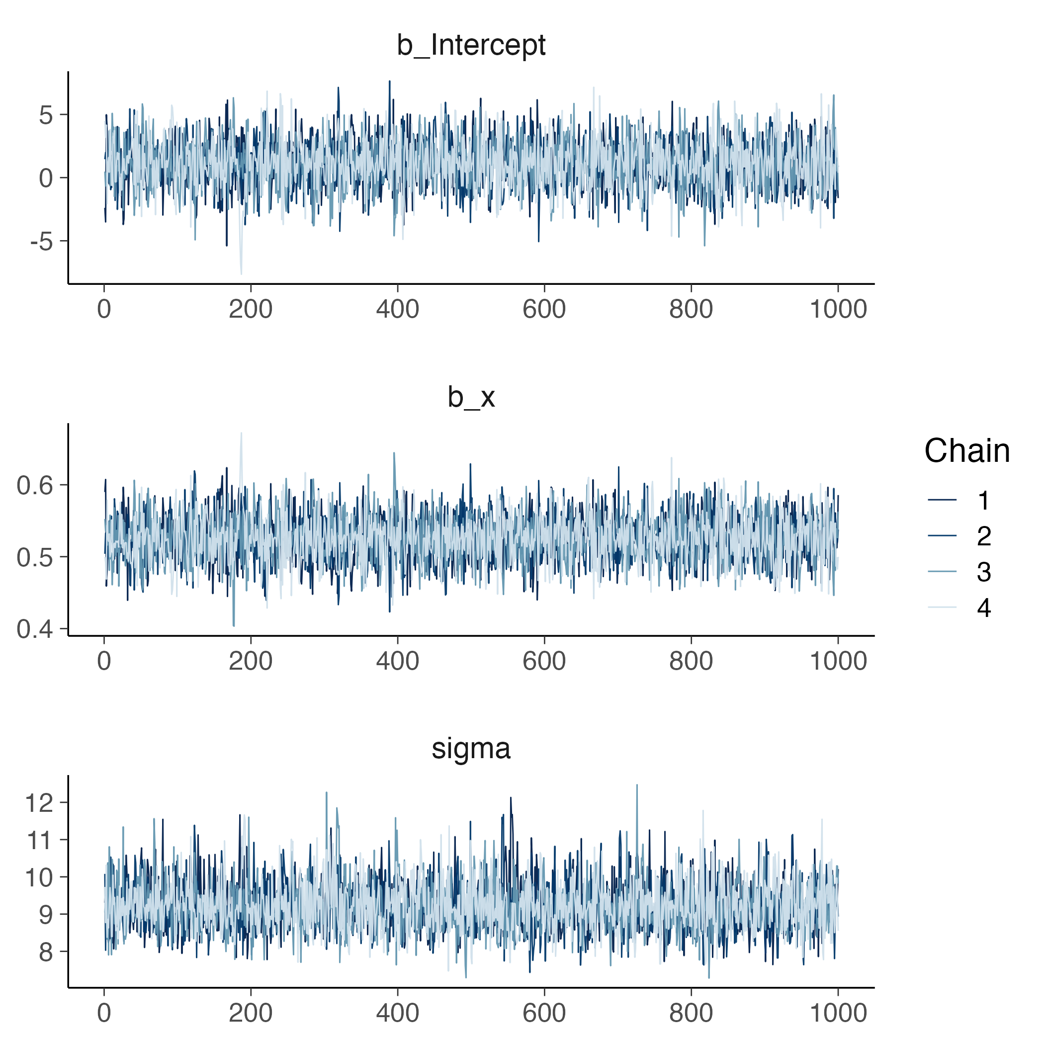 brm(y ~ x, data = dati)Questa singola istruzione è sufficiente per adattare un modello di regressione lineare bivariato. brms assume automaticamente una verosimiglianza normale e, se non specificati, utilizza prior debolmente informativi per tutti i parametri (intercetta, pendenza, deviazione standard).