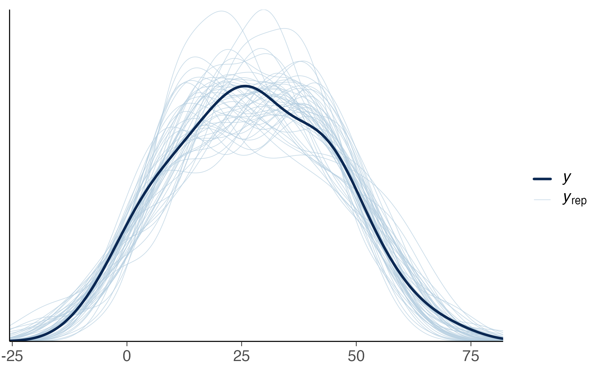 Nel grafico risultante, la linea scura rappresenta la distribuzione dei dati osservati, mentre le linee più chiare mostrano le distribuzioni dei dati simulati dal modello. Un buon modello dovrebbe produrre simulazioni che si sovrappongono ragionevolmente ai dati osservati. Discrepanze sistematiche possono indicare problemi nella specificazione, come non-linearità non catturate o errori che deviano dalla normalità.