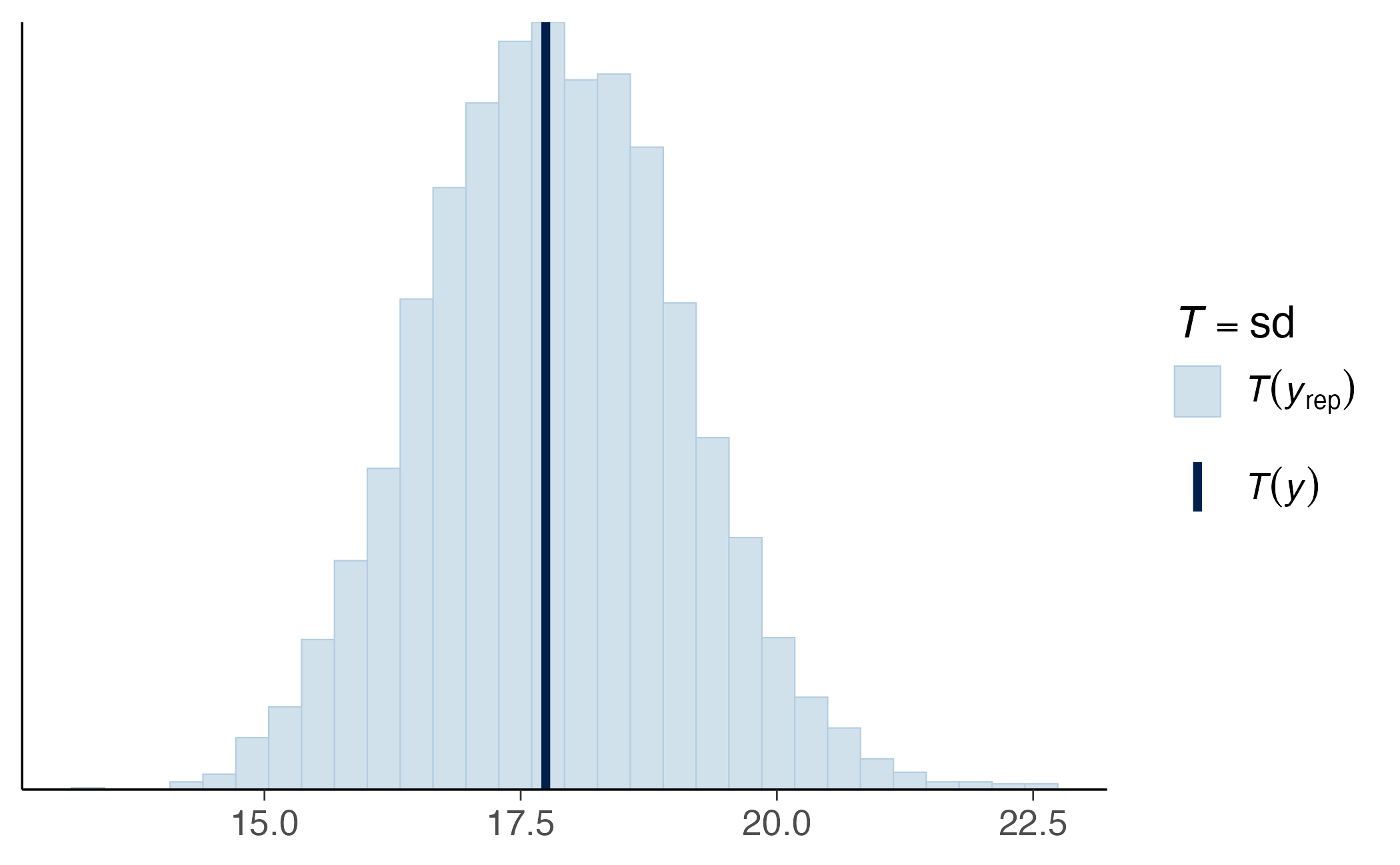 Il posterior predictive check confronta i dati osservati con dati simulati dal modello stimato. Se il modello cattura adeguatamente le caratteristiche dei dati, le simulazioni dovrebbero essere simili alle osservazioni reali. Discrepanze sistematiche (es. differenze nelle code della distribuzione, nella variabilità, o nella forma) suggeriscono che il modello non è adeguato e potrebbe richiedere modifiche nella specificazione (es. distribuzione degli errori diversa dalla normale, termini non lineari).