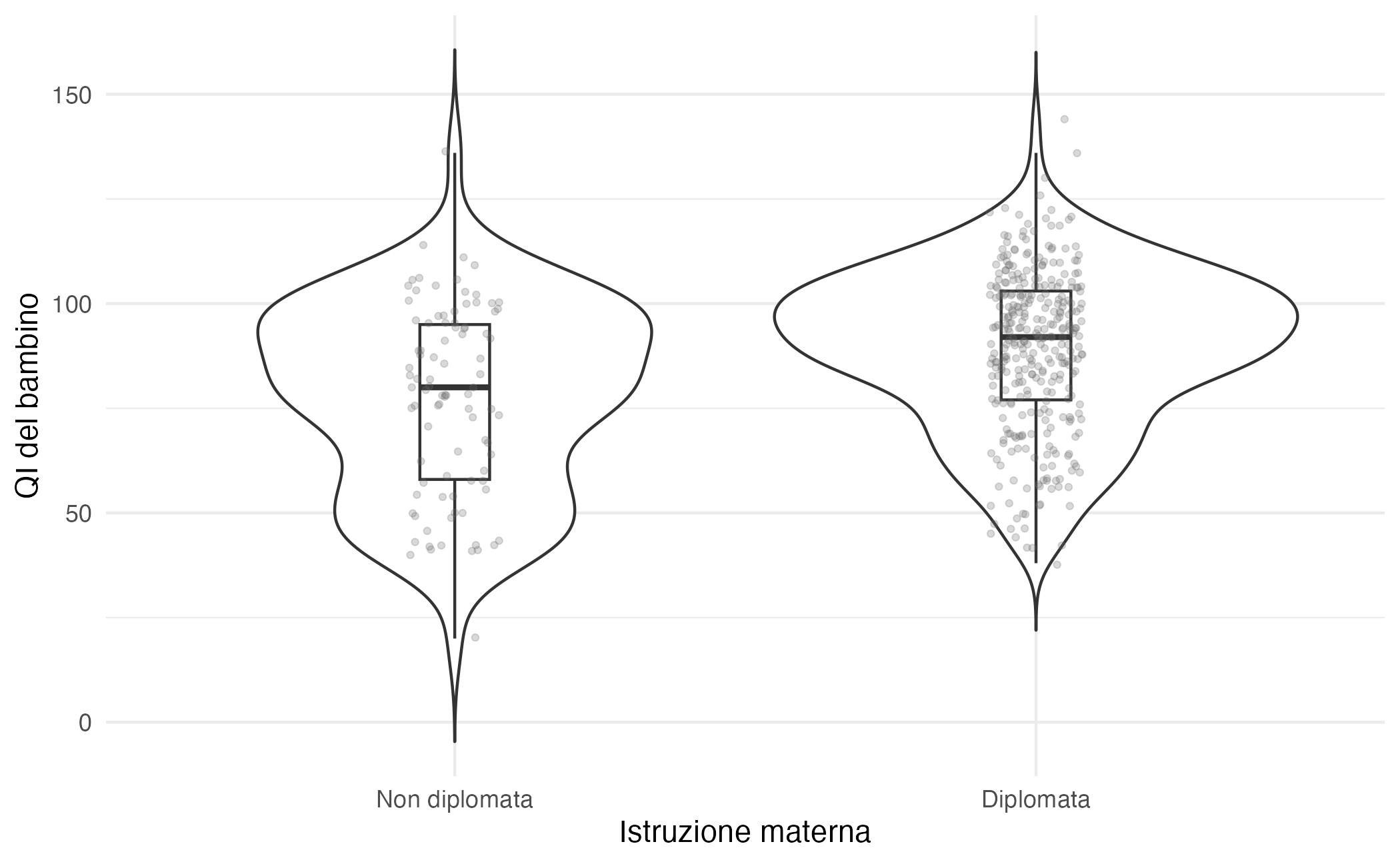 Per poter confrontare in modo rigoroso due gruppi, introduciamo un predittore binario \(x_i\), che vale 0 per il gruppo di riferimento e 1 per il gruppo di confronto. Il modello lineare è \(y_i=\alpha+\beta x_i+\varepsilon_i\), con \(\varepsilon_i\sim \mathcal N(0,\sigma)\). In questa formulazione, \(\alpha\) rappresenta la differenza tra le due medie. L’assunzione di omoschedasticità, ovvero di una varianza uguale nei due gruppi, rende il modello particolarmente trasparente al primo incontro.