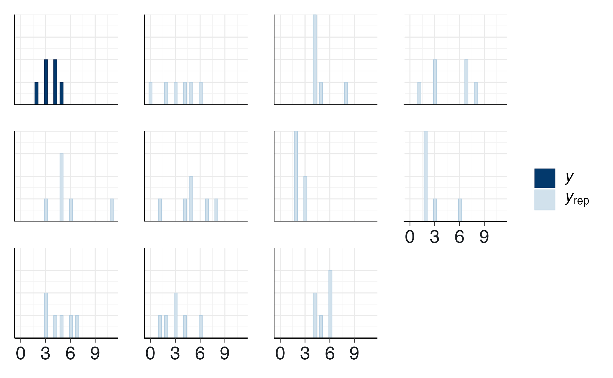 Prima di procedere con la stima del modello, è fondamentale valutare quali implicazioni comporti la scelta delle distribuzioni a priori sui dati generabili. È utile chiedersi: con quale frequenza le prior generano valori nulli? Quante volte producono valori superiori a 8? Se le simulazioni restituiscono sistematicamente valori irrealistici per il contesto psicologico in esame, sarà necessario ricalibrare le prior, modificandone la localizzazione o l’ampiezza.