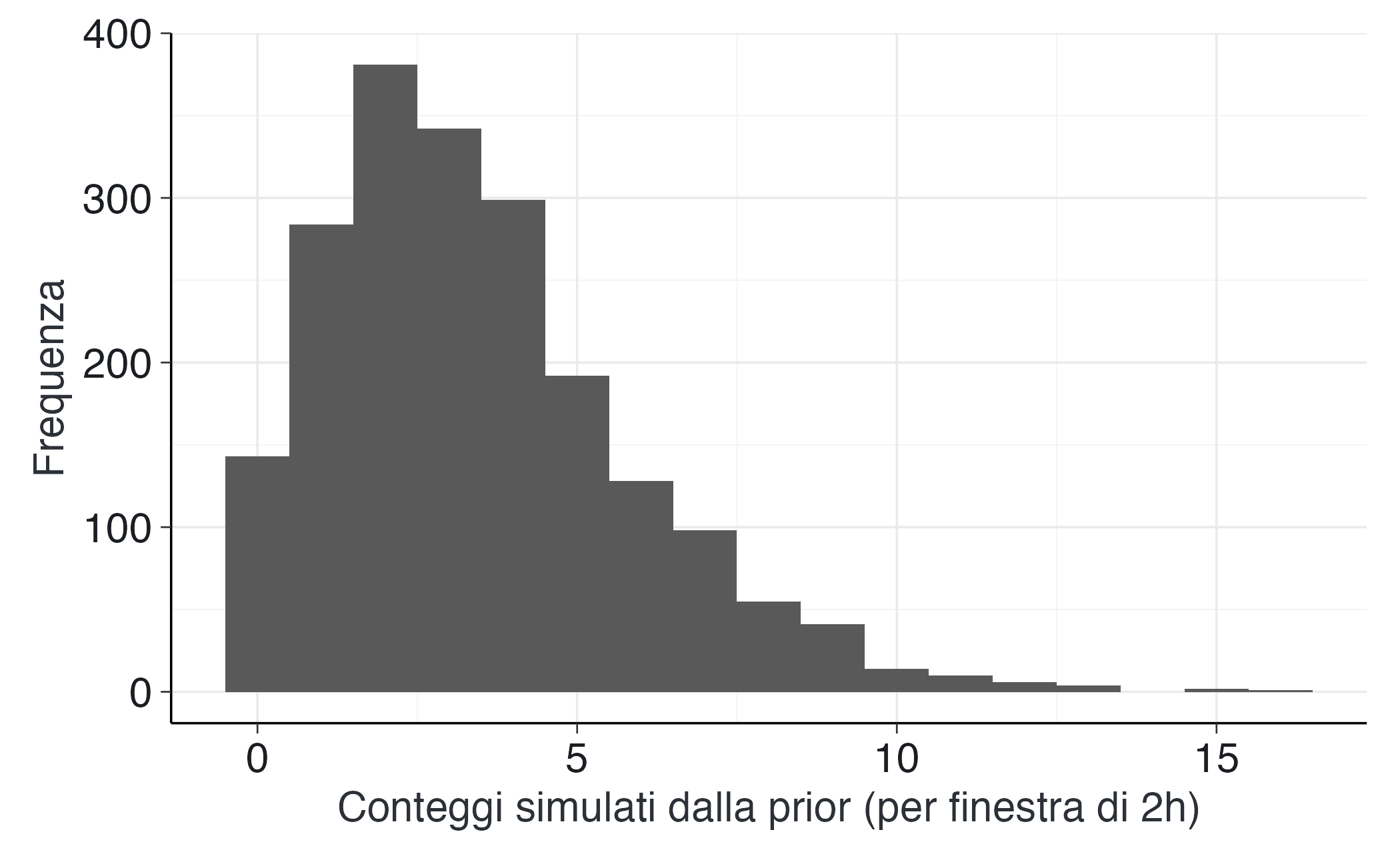 Chiamiamo questo parametro \(\lambda\): rappresenta il numero medio di eventi attesi per finestra di due ore per una giornata tipica di questa persona. Nel modello bayesiano stimiamo \(\lambda\) tenendo conto sia della variabilità tra finestre sia dell’esiguità del campione.