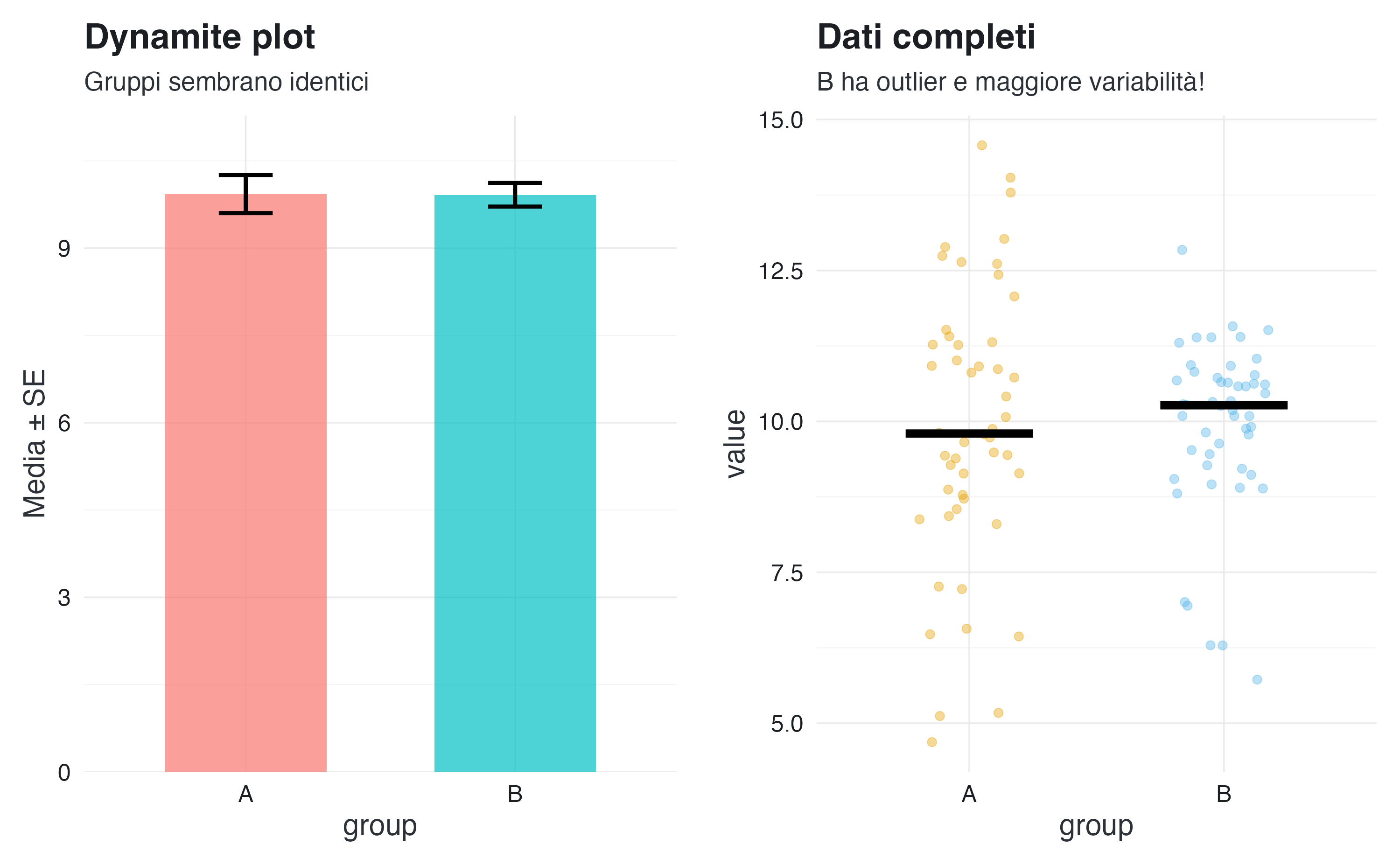 La soluzione. Sostituire i grafici a barre con visualizzazioni che rendano espliciti i dati osservati. Tecniche come il jitter, la trasparenza (alpha blending) e la sovrapposizione dei punti individuali consentono di mostrare la variabilità reale. In alternativa, o in aggiunta, è preferibile utilizzare sintesi più informative e robuste, come boxplot o grafici a violino, eventualmente combinati con i singoli punti.