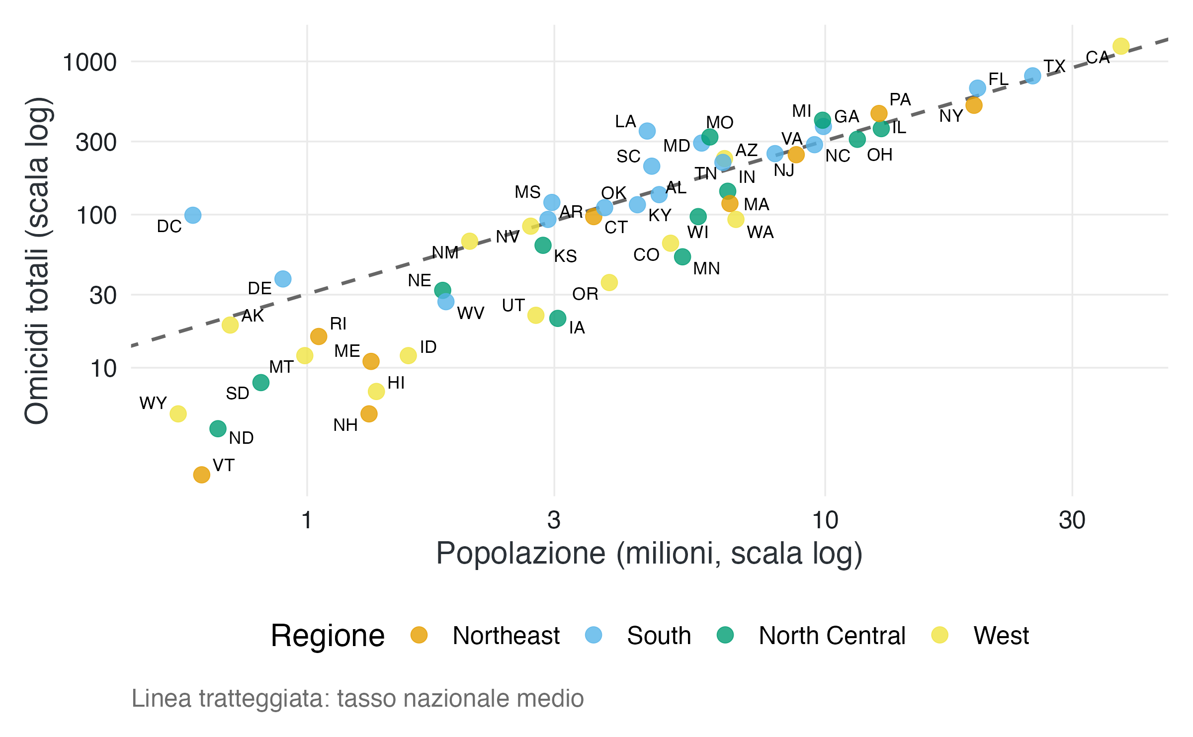 Esempio concreto. In un grafico che confronta il numero di omicidi tra Stati con popolazioni molto diverse, una scala logaritmica consente di visualizzare simultaneamente e con chiarezza realtà piccole come il Wyoming (circa 500.000 abitanti) e Stati molto popolosi come la California (circa 39 milioni), evitando che i primi vengano schiacciati sull’asse.