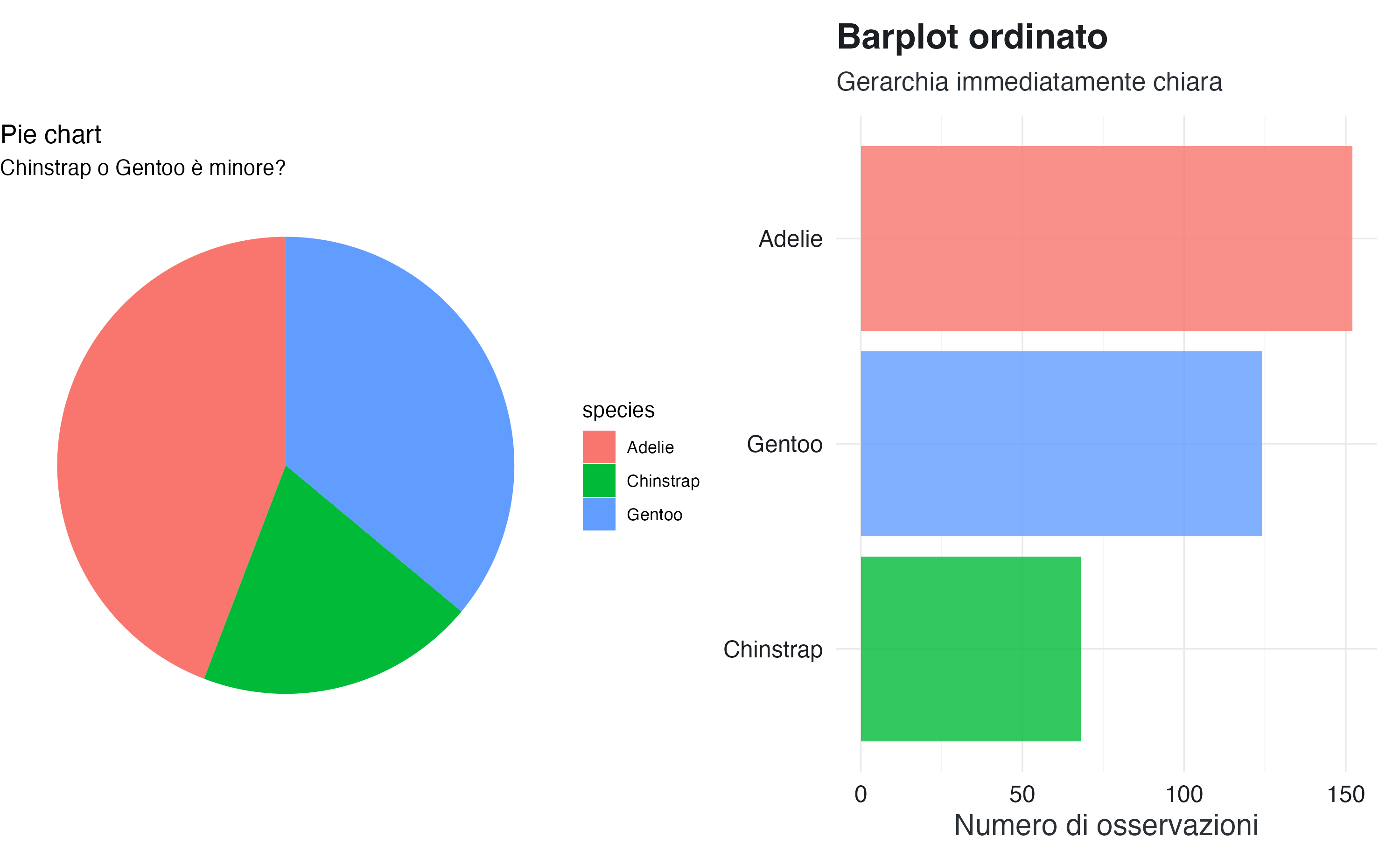 Verdetto: per confronti quantitativi, usa sempre lunghezza (barplot), mai angoli (pie).