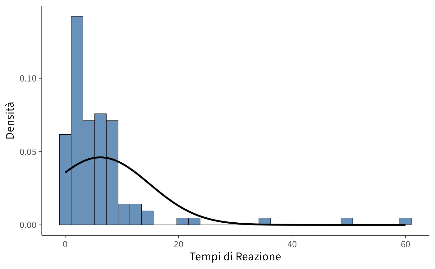 Per illustrare il concetto, utilizziamo un set di dati simulati che presentano proprietà simili a quelle dei tempi di reazione. Creeremo un istogramma e vi sovrapporremo la curva di densità normale calcolata in base ai dati.