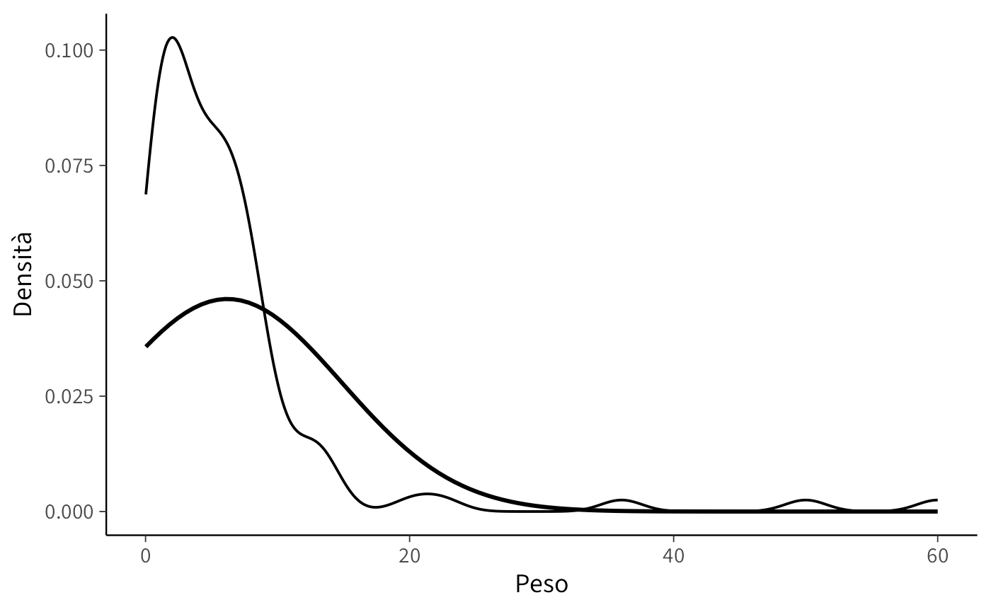 )L’istogramma mostra la distribuzione empirica dei dati, mentre la curva rossa rappresenta la densità normale con la stessa media e deviazione standard. Nel nostro caso, è evidente una discrepanza tra la distribuzione empirica e la densità normale, il che indica che l’ipotesi di normalità non è appropriata.