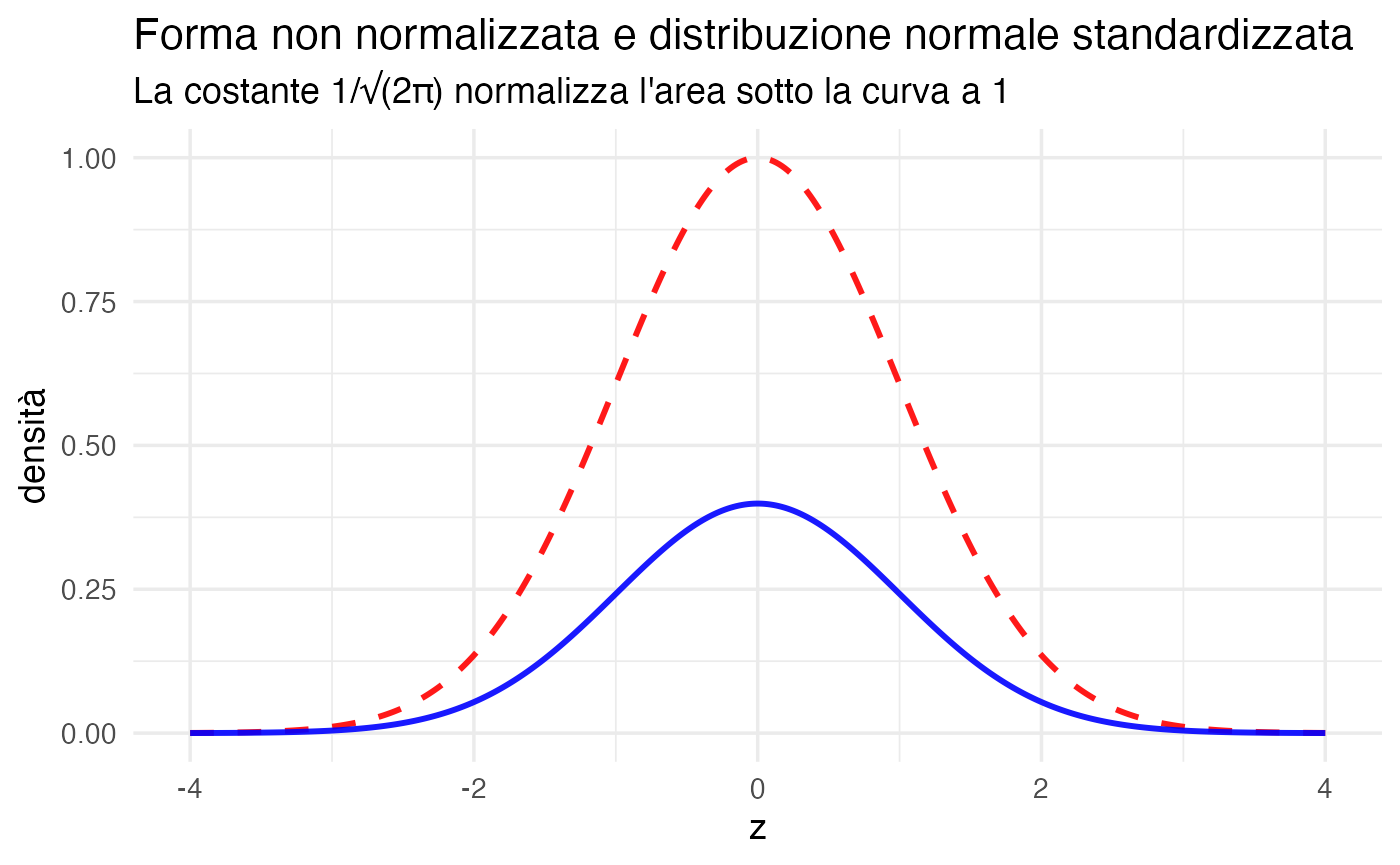 theme_minimal(base_size = 13)La curva rossa (non normalizzata) è semplicemente una versione riscalata della blu (normalizzata). L’aggiunta del termine \(1 / \sqrt{2\pi}\) garantisce che l’area totale sotto la curva rappresenti una probabilità unitaria.