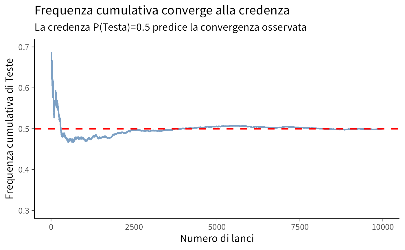Scopriremo che gli assiomi della probabilità non sono “leggi naturali” della casualità, ma vincoli di coerenza logica tra le nostre credenze. Quando violiamo questi vincoli, le nostre assegnazioni di probabilità diventano contraddittorie e ci espongono a situazioni paradossali (il famoso “Dutch Book”). Le simulazioni al computer, che utilizzeremo ampiamente, non definiranno cosa sia la probabilità, ma illustreranno come credenze coerenti si comportano quando vengono verificate empiricamente.
