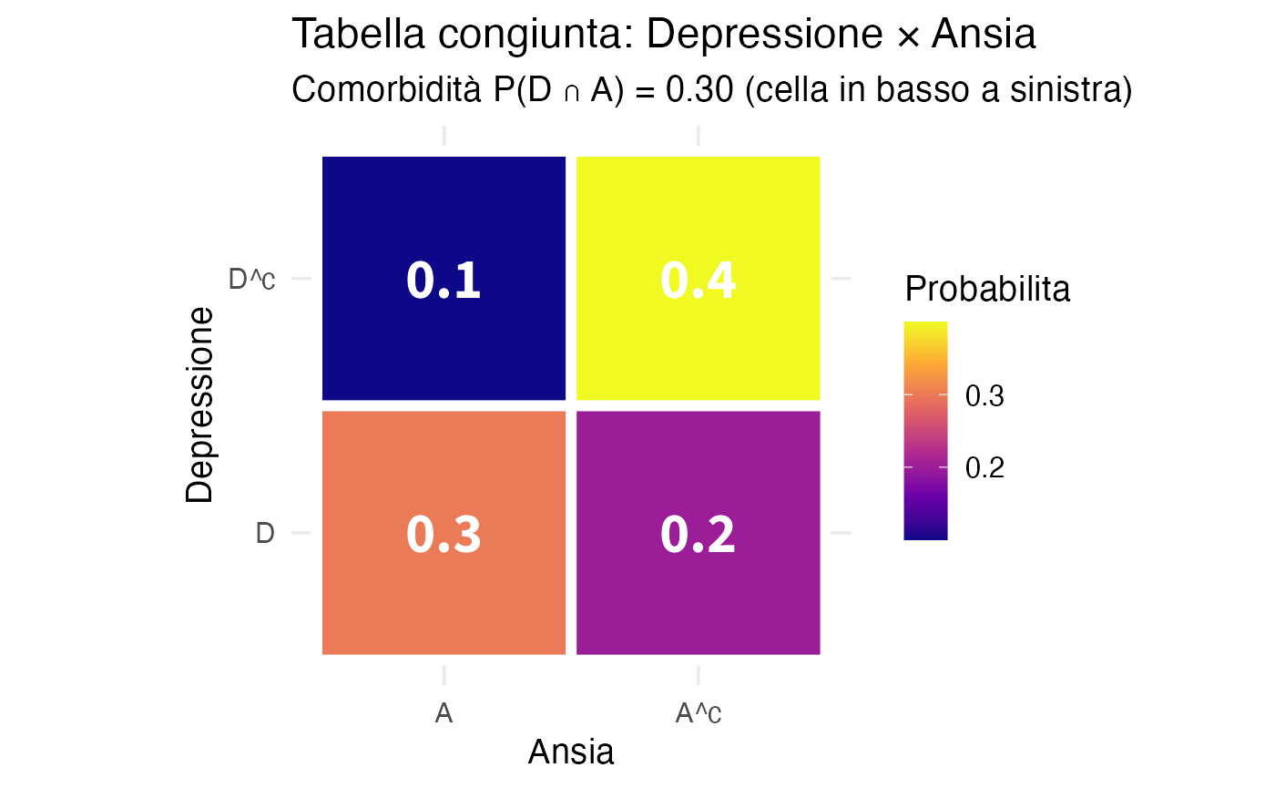 subtitle = "Comorbidità P(D ∩ A) = 0.30 (cella in basso a sinistra)"