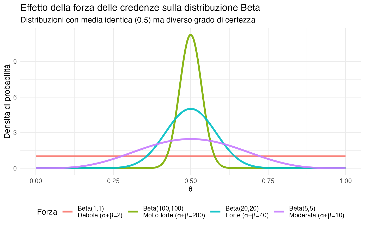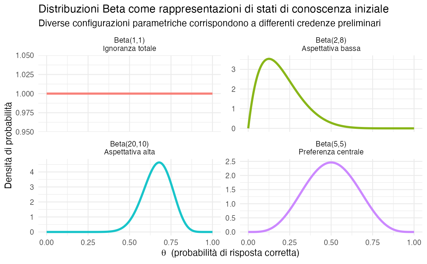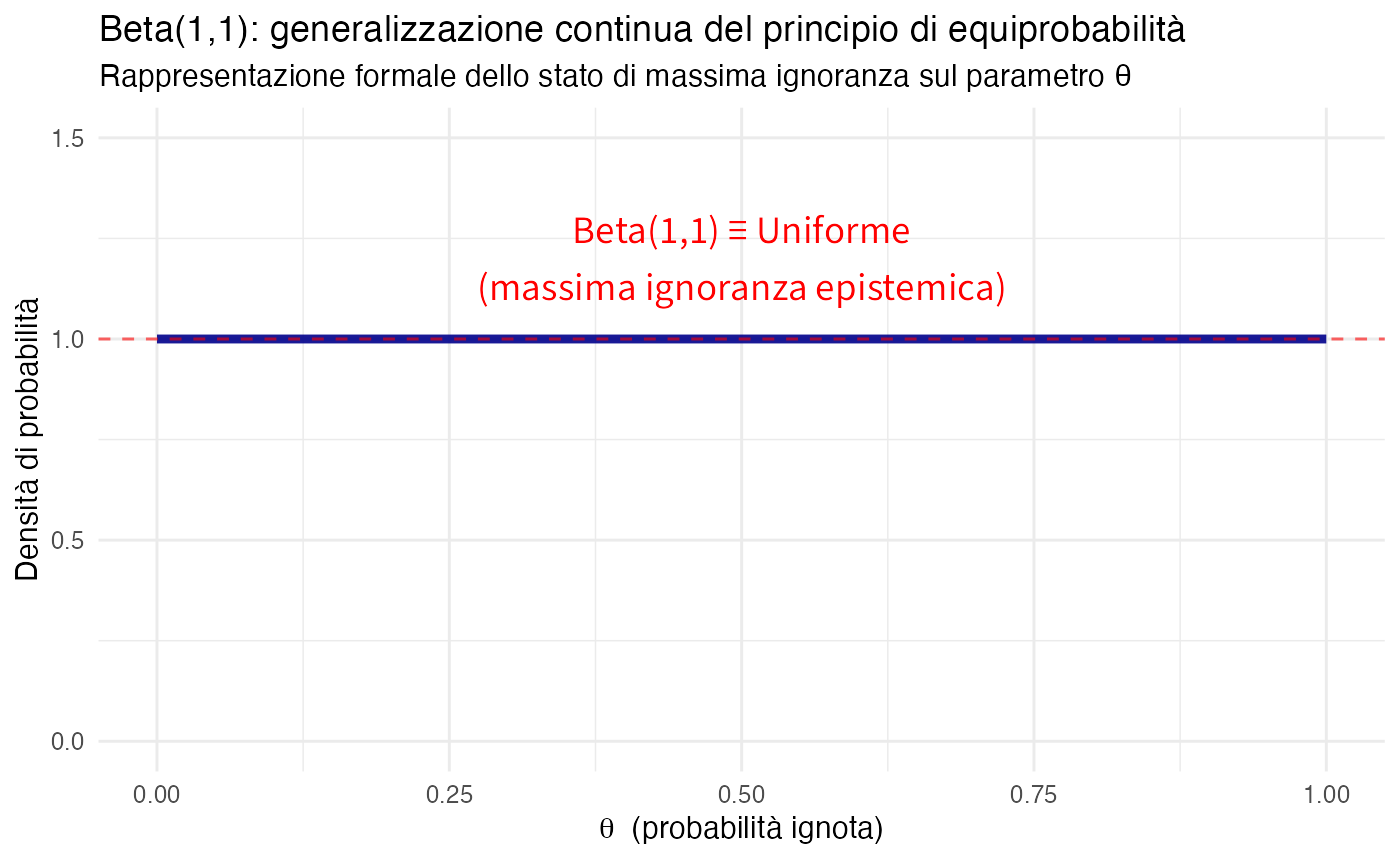 La transizione dal discreto al continuo trova nella distribuzione Beta la sua naturale generalizzazione. La distribuzione Beta(1,1) corrisponde alla distribuzione uniforme, che rappresenta lo stato di massima ignoranza, mentre le distribuzioni Beta(α, β) parametrizzano credenze caratterizzate da una “forza” data da α + β. L’aggiornamento bayesiano consente il passaggio dalle credenze a priori a quelle a posteriori mediante l’applicazione coerente del teorema di Bayes.