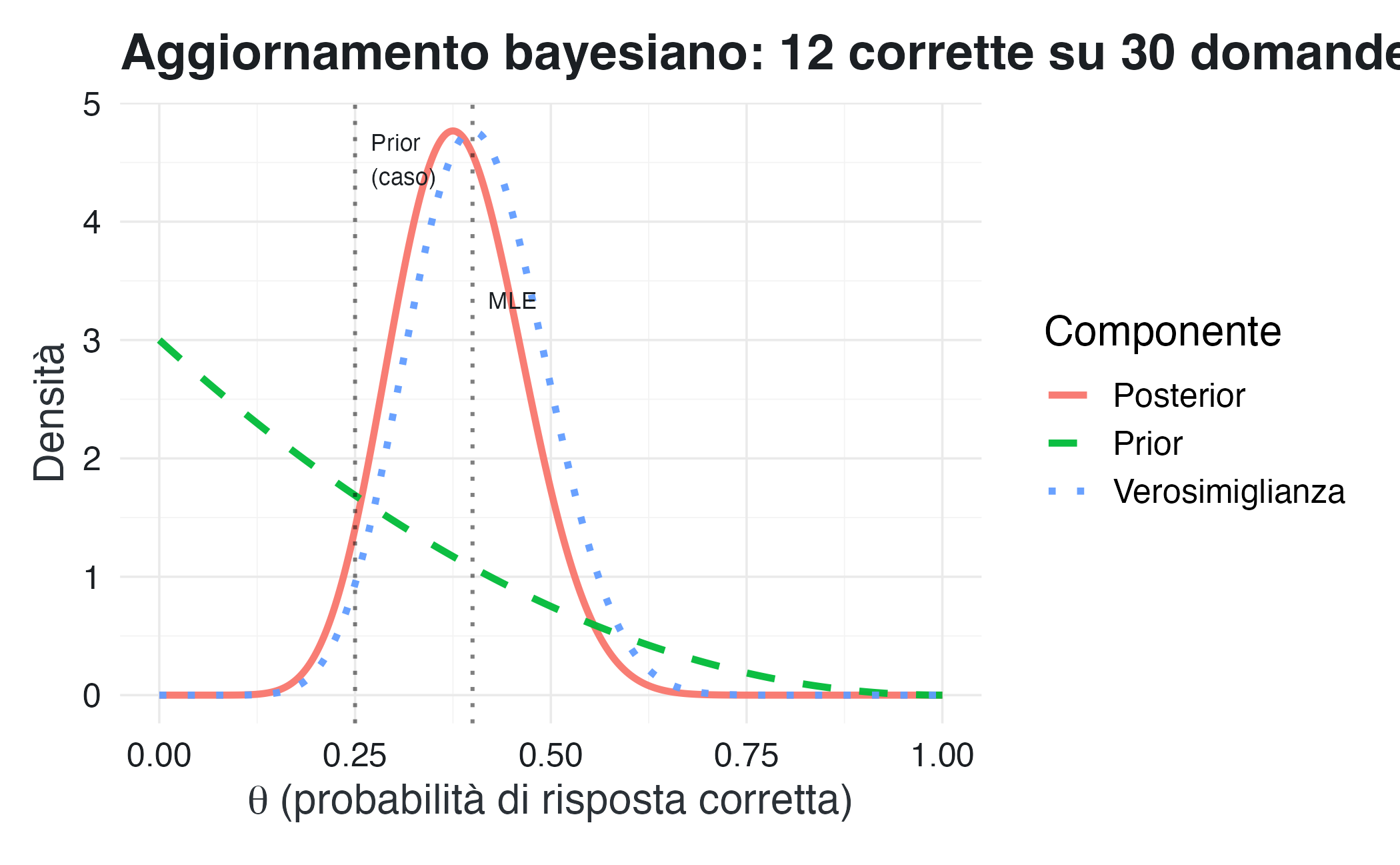 In pratica, questo significa che ciò che determina la forma del posterior è il prodotto verosimiglianza × prior. Il denominatore è lo stesso per tutte le ipotesi che stiamo confrontando e quindi non influenza i loro rapporti relativi.