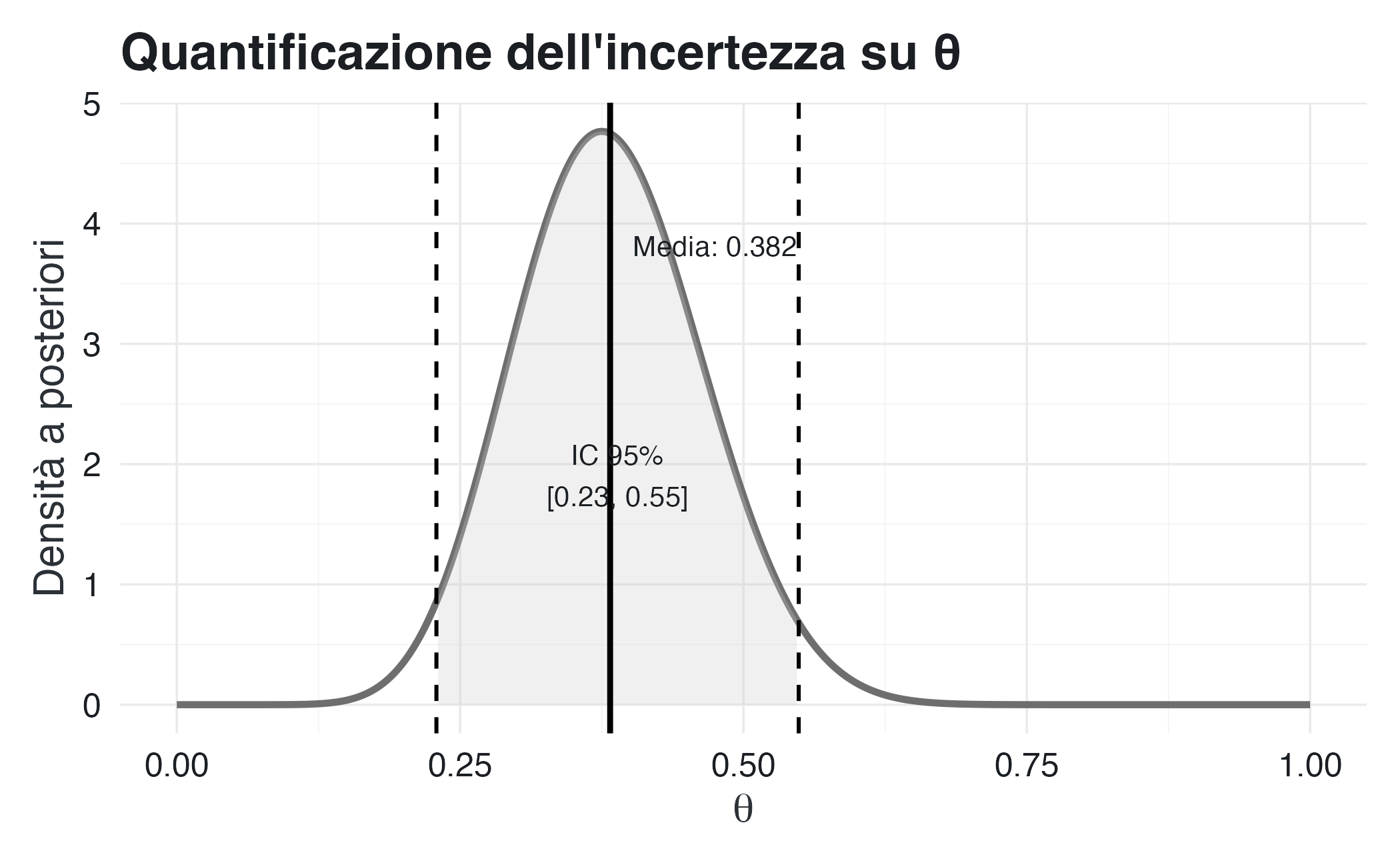 “C’è una probabilità del 95% che il vero valore del parametro sia compreso tra 0.23 e 0.55, date le nostre informazioni.”