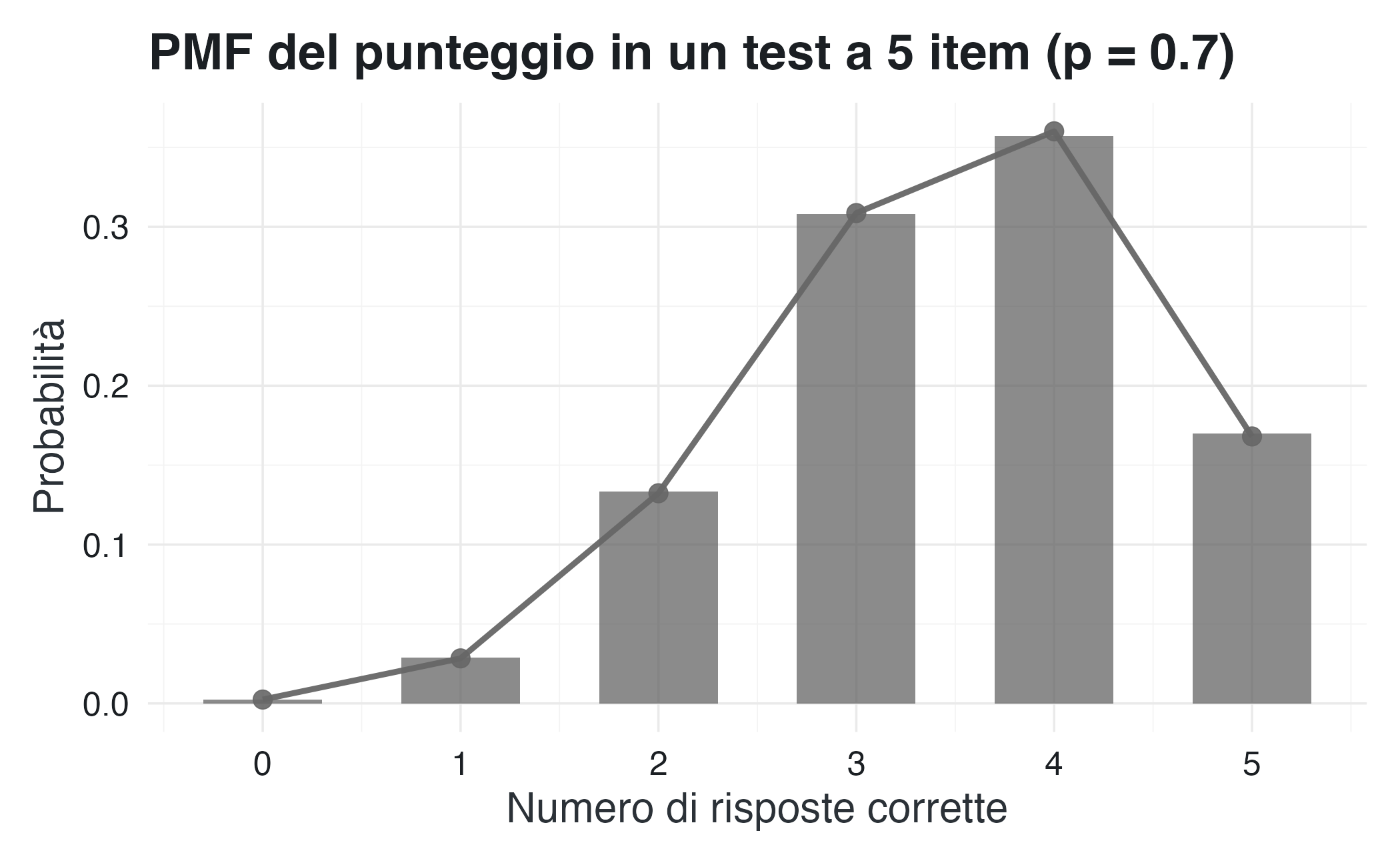 Riprendiamo il test di memoria di lavoro a 5 item. Supponiamo che ogni risposta sia corretta con probabilità \(p = 0.7\), indipendentemente dalle altre. La variabile casuale \(X\) (numero di risposte corrette) può assumere valori compresi tra 0 e 5.