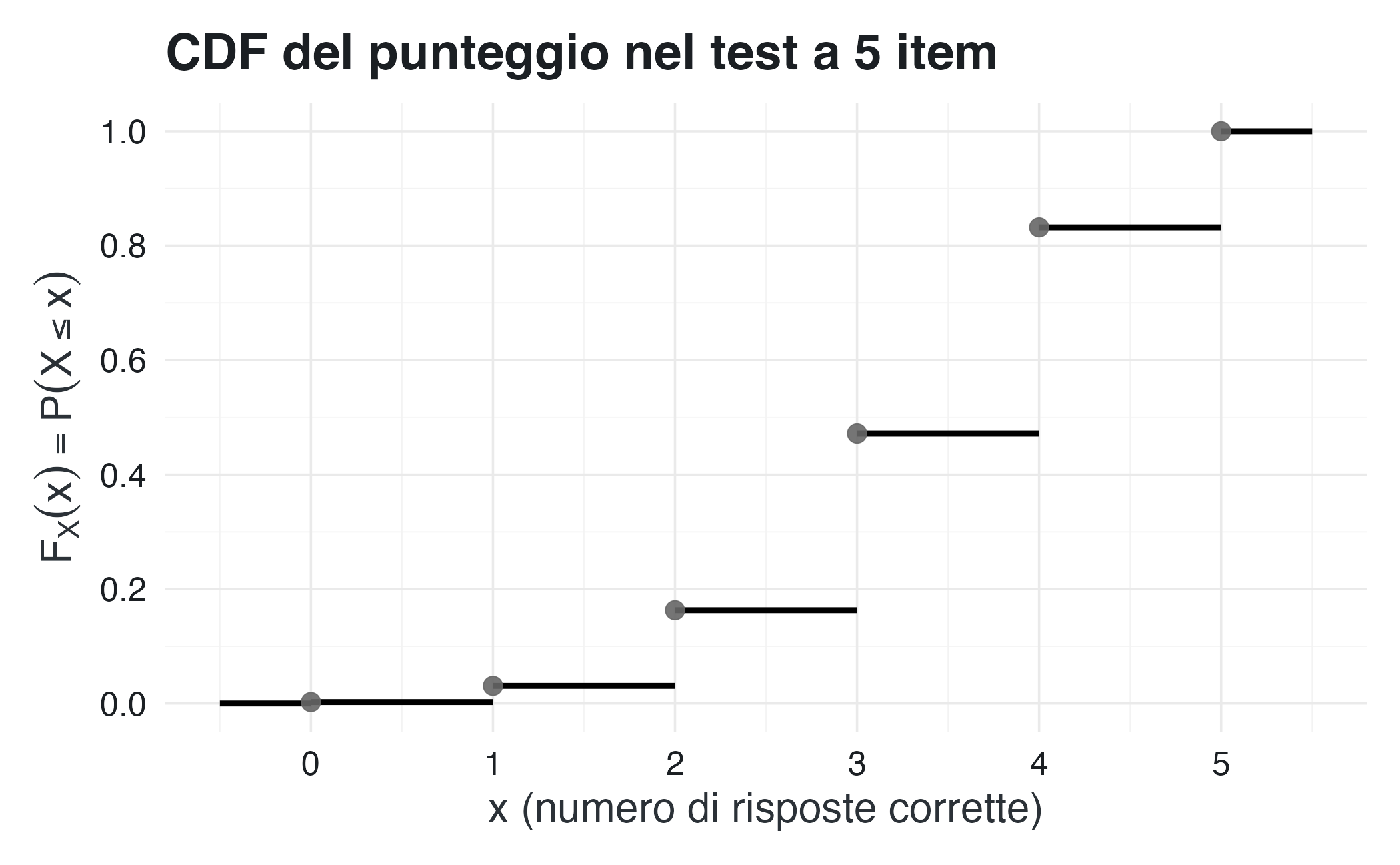 Per l’esito \(\omega = CCECE\), ad esempio, il valore della variabile casuale è \(X(CCECE) = 3\). La funzione \(X\) è perfettamente deterministica: data la sequenza di risposte, il punteggio è univocamente determinato. L’incertezza riguarda solo quale sequenza di risposte verrà osservata.