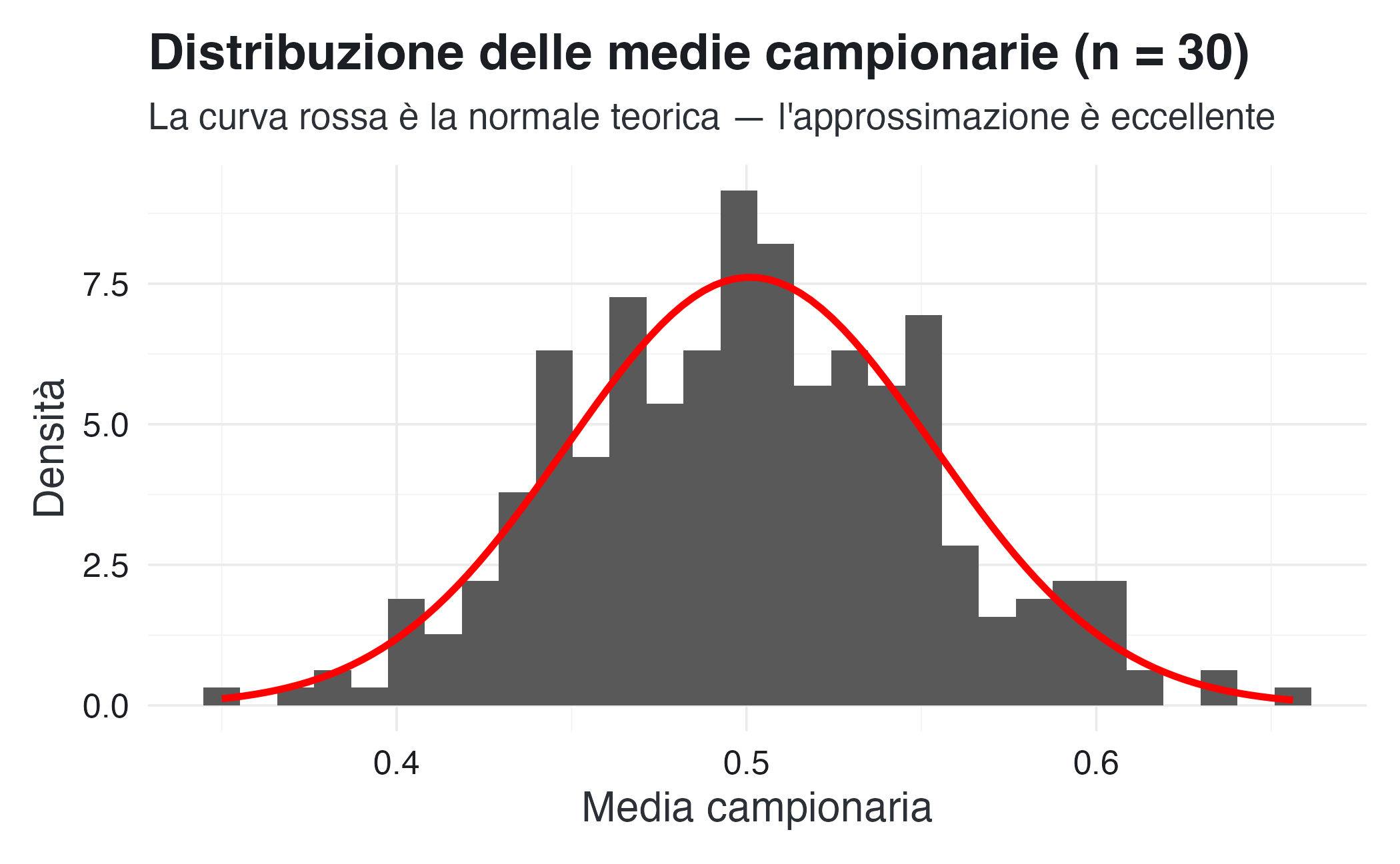 - Regola pratica: \(n \geq 30\) spesso sufficiente, ma dipende dalla simmetria