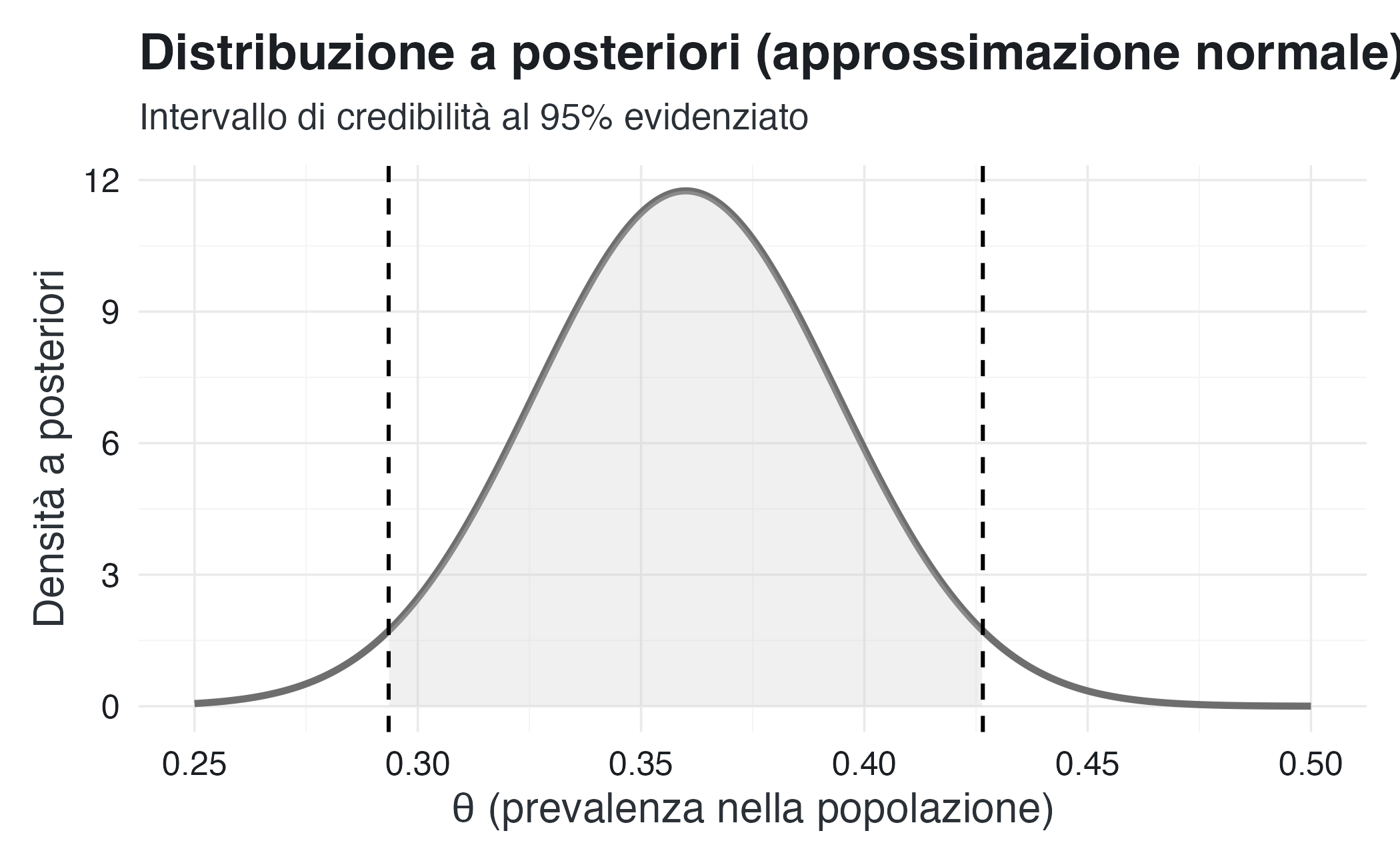 A partire dalla distribuzione a posteriori possiamo ricavare diverse sintesi statistiche. Una delle più informative è l’intervallo di credibilità, che riassume l’incertezza sulla stima del parametro. Ad esempio, un intervallo di credibilità al 95% per \(\theta\) potrebbe essere [0.29; 0.43]. L’interpretazione è diretta: alla luce delle informazioni disponibili (prior e dati), riteniamo che vi sia una probabilità del 95% che il valore vero della prevalenza nella popolazione si trovi tra 0.29 e 0.43.