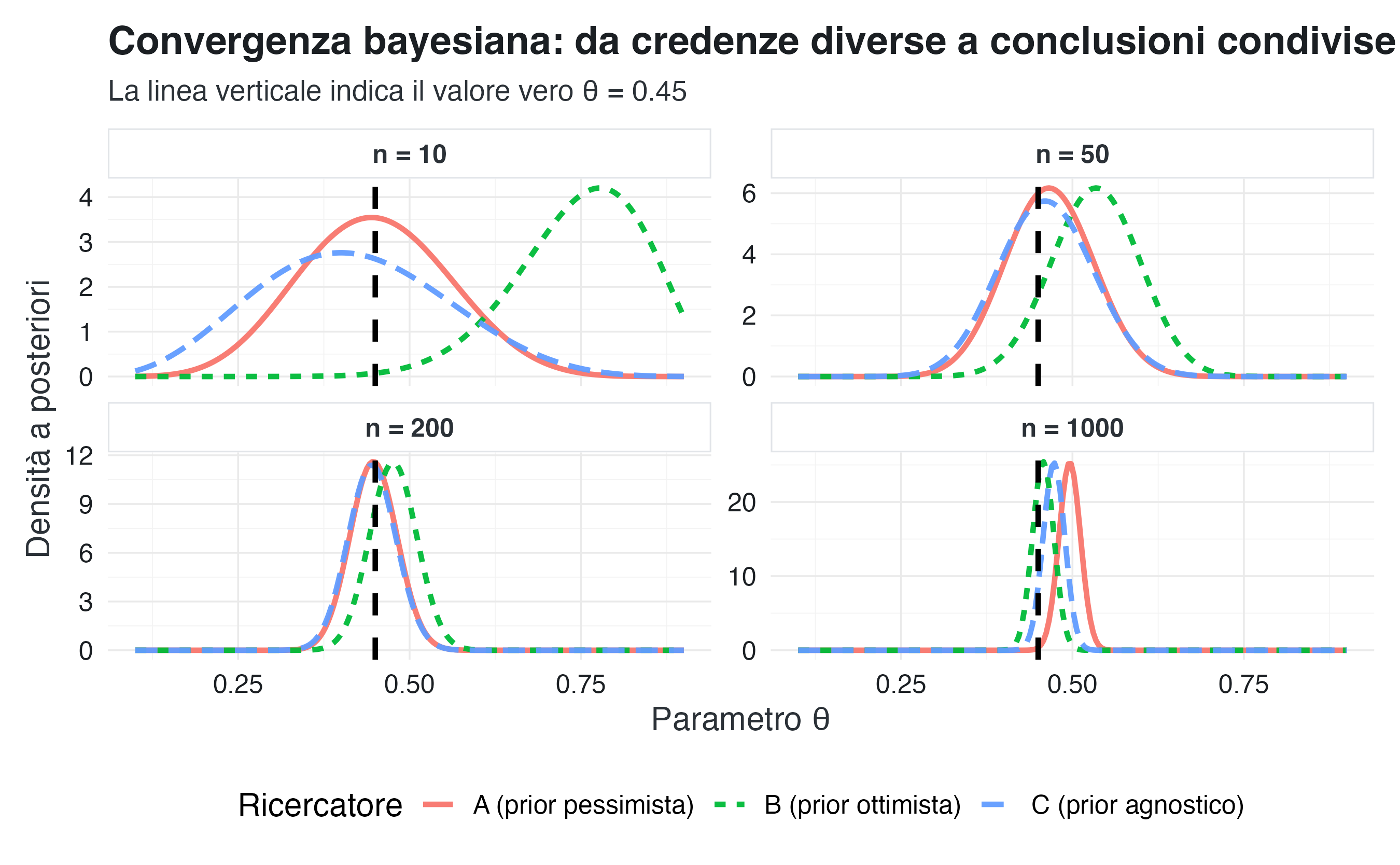 L’inferenza bayesiana si conferma come un framework coerente per rappresentare e aggiornare l’incertezza epistemica. Le credenze iniziali (prior) vengono integrate in modo logico con i nuovi dati, producendo una distribuzione a posteriori che rappresenta lo stato più informato delle nostre conoscenze. Con evidenza sufficiente, credenze iniziali anche molto diverse tendono a convergere verso stime condivise, garantendo oggettività nel lungo termine.