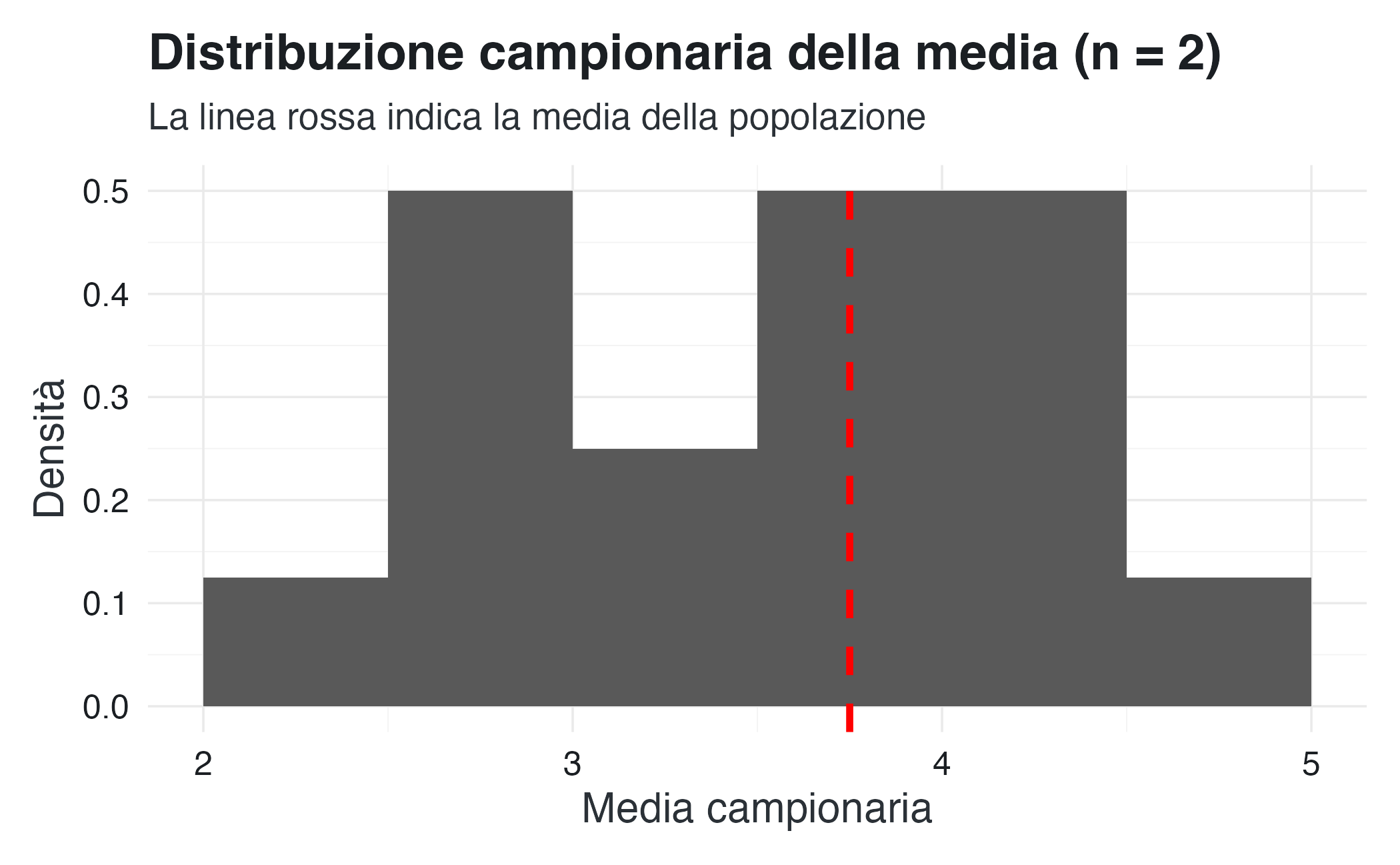 Supponiamo ora di estrarre tutti i possibili campioni di dimensione \(n = 2\) con reinserimento (come faremmo campionando da una popolazione molto grande). Ciò genera \(4^2 = 16\) campioni possibili.