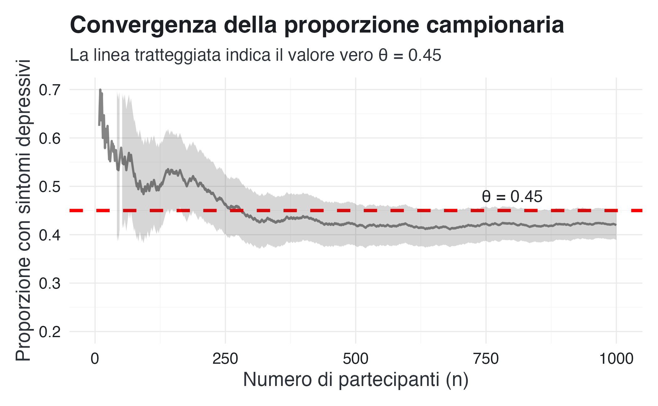 Immaginiamo di voler stimare la prevalenza di sintomi depressivi clinicamente rilevanti nella popolazione studentesca universitaria. Poiché non è possibile osservare l’intera popolazione, ci affidiamo a un campione e utilizziamo l’inferenza statistica per generalizzare i risultati.