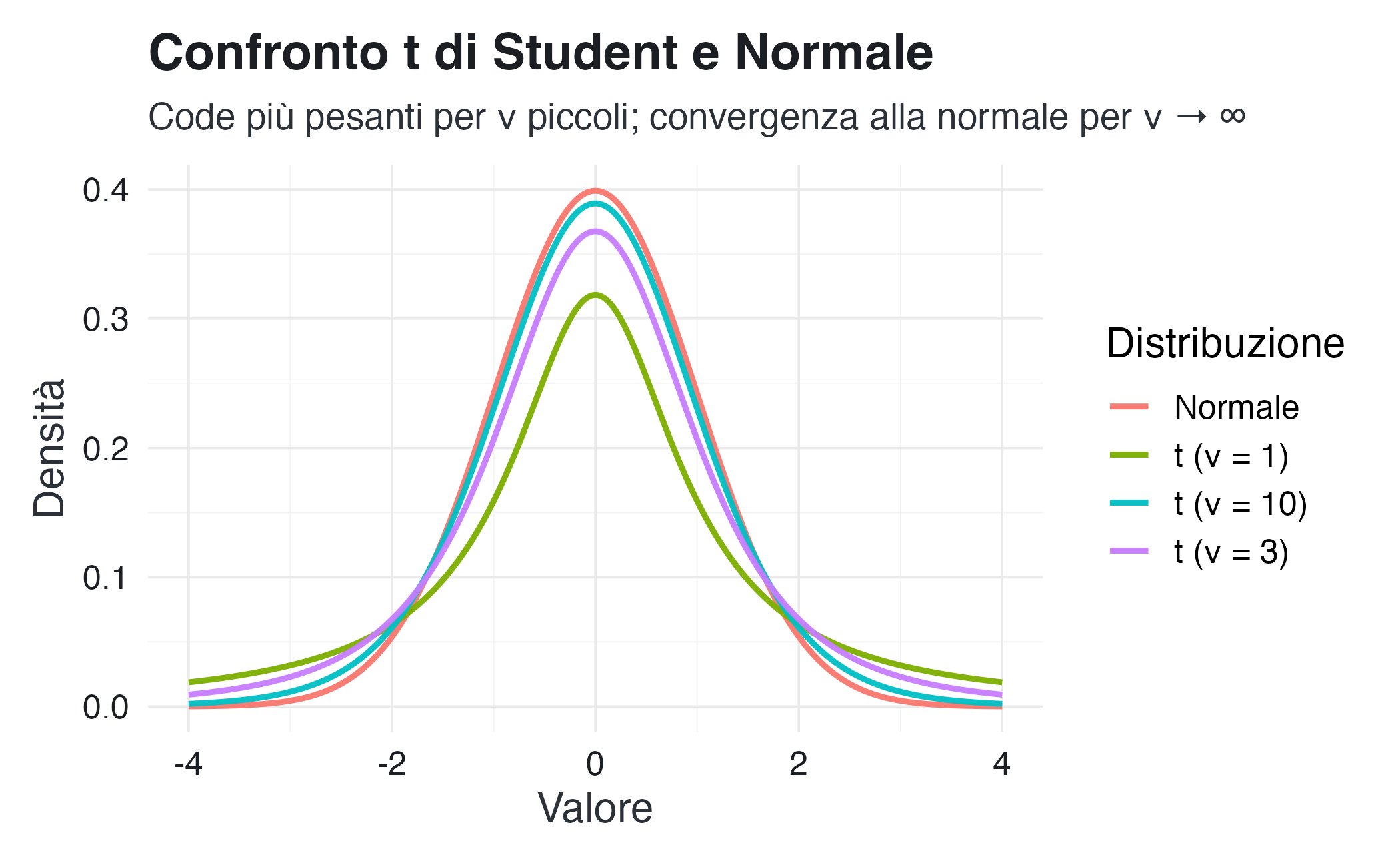 L’esposizione procederà con una progressione graduale, dalle distribuzioni concettualmente più semplici a quelle con ruoli più specifici nell’inferenza bayesiana. Si inizierà con la distribuzione uniforme, che formalizza un’ignoranza locale e simmetrica all’interno di un intervallo finito. Si passerà quindi alla distribuzione esponenziale, fondamentale per modellare i tempi di attesa e i fenomeni privi di memoria, e alla distribuzione normale, pilastro del Teorema del Limite Centrale e modello di riferimento per le misurazioni affette da errori casuali simmetrici. Successivamente, si esamineranno la distribuzione chi-quadrato e la distribuzione t di Student, che derivano direttamente dalla normale e sono essenziali per l’inferenza su varianze e per la modellazione robusta con piccoli campioni. Si concluderà con le distribuzioni di massima rilevanza bayesiana: la beta come prior naturale per proporzioni e probabilità, la gamma per tassi e varianze, e la Cauchy come prior robusto a code pesanti, in grado di gestire valori anomali senza influenzare eccessivamente le stime.