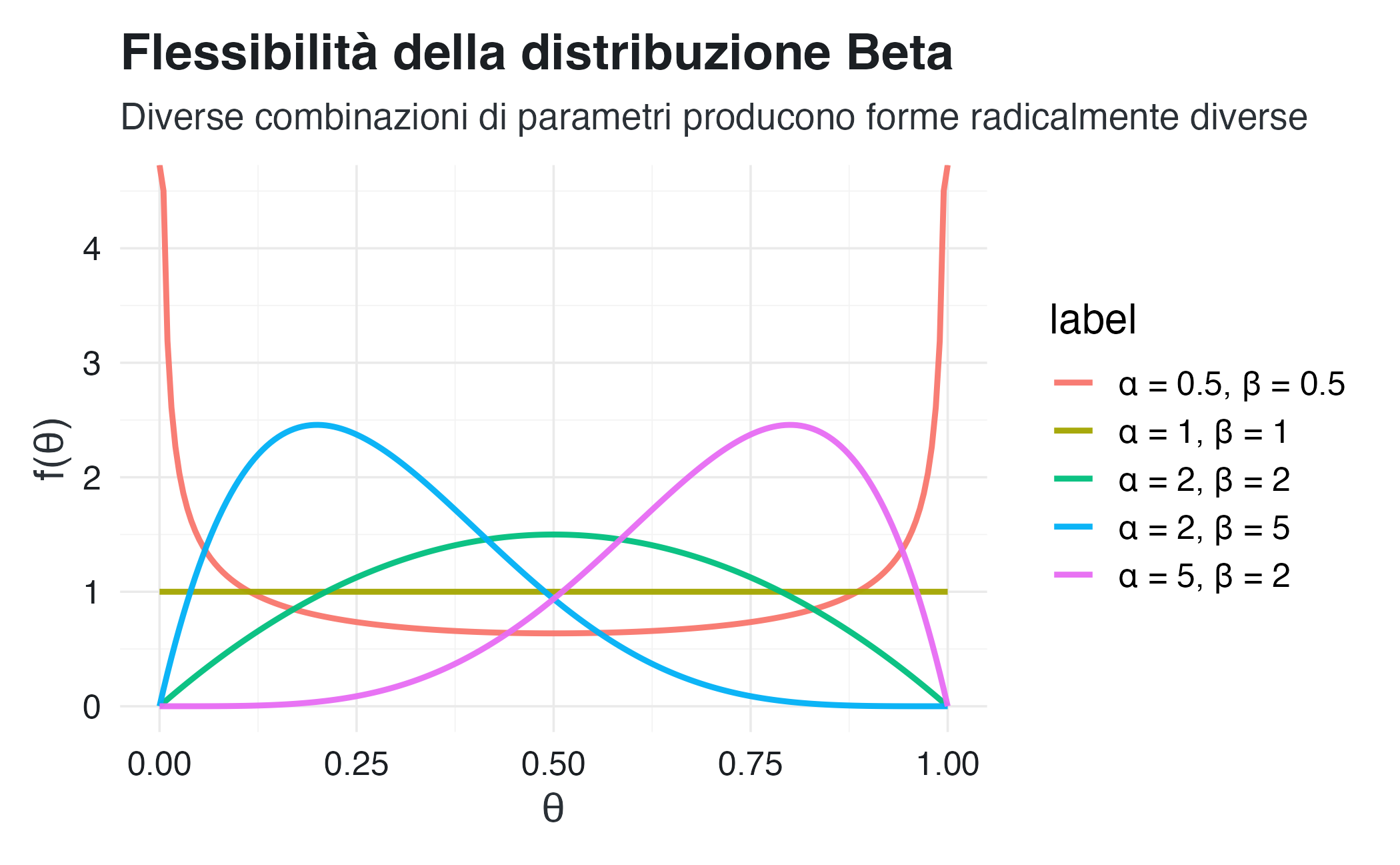 - \(\mathbb{E}[\theta] = \frac{\alpha}{\alpha+\beta}\), Moda \(= \frac{\alpha-1}{\alpha+\beta-2}\) (se \(\alpha,\beta > 1\))