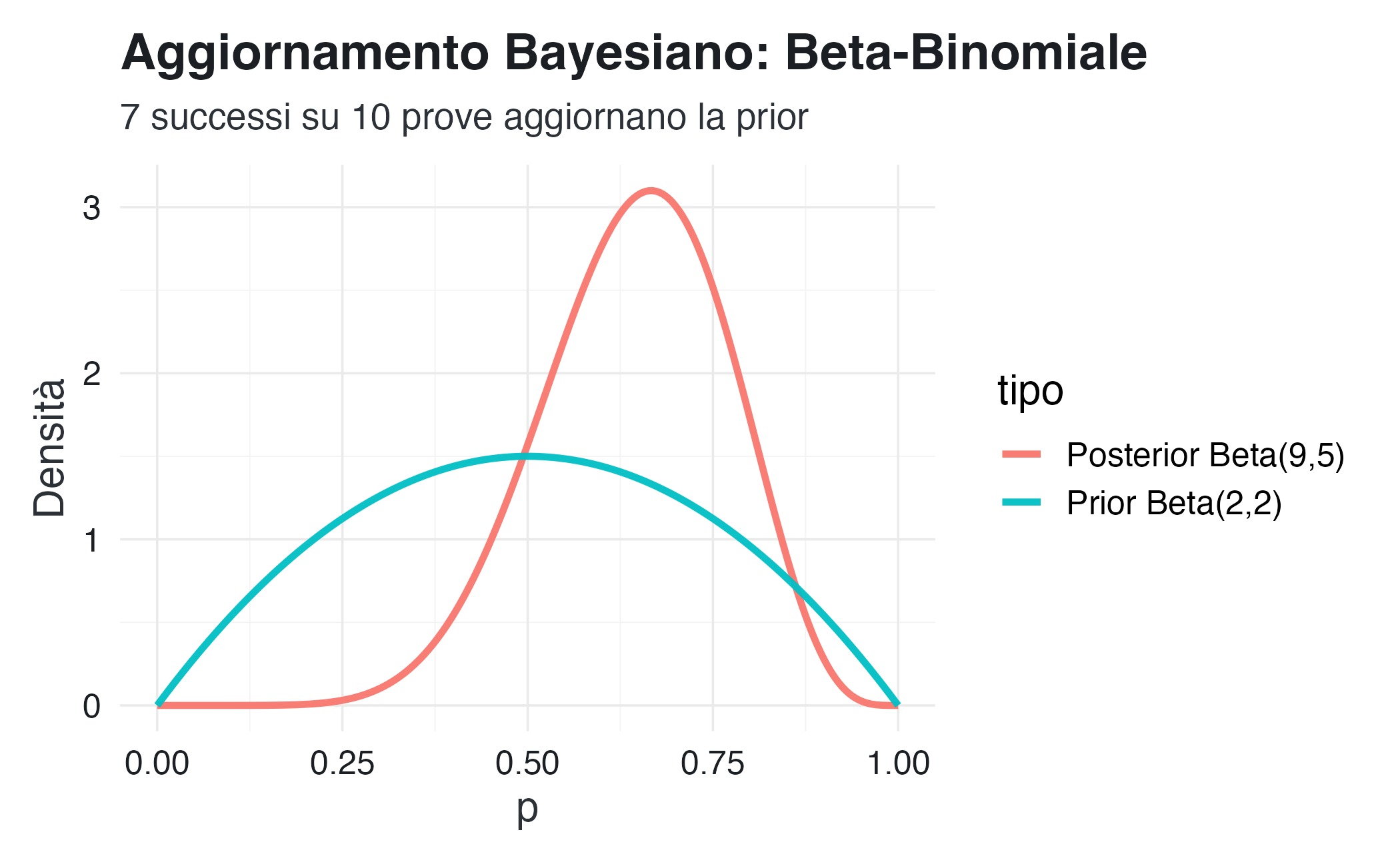 - Interpretazione: \(\alpha-1\) = “successi pregressi”, \(\beta-1\) = “fallimenti pregressi”