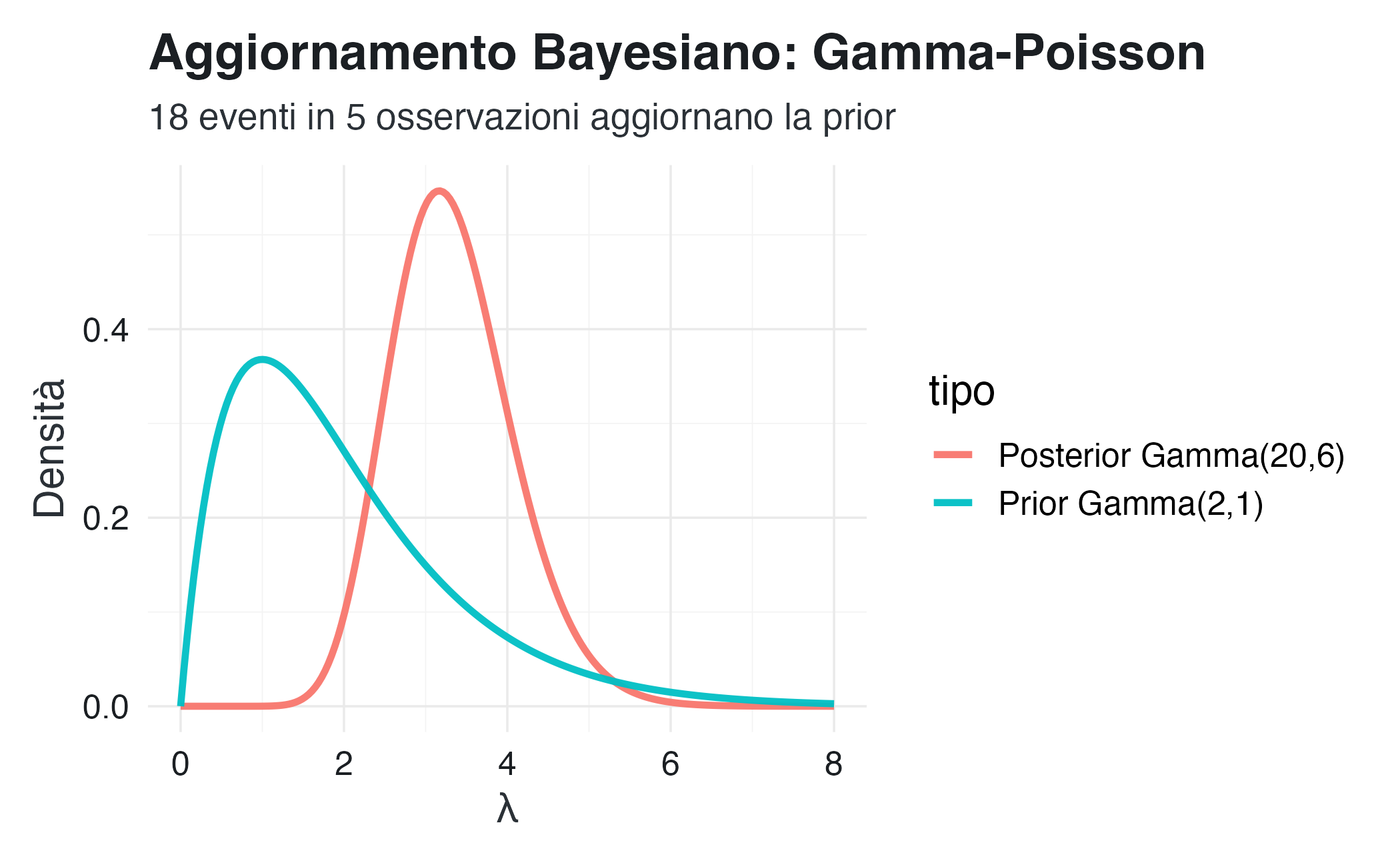 Interpretazione epistemica: il parametro di forma \(\alpha\) accumula il conteggio degli eventi (reali e pseudo-osservati), mentre il parametro di velocità \(\beta\) accumula il tempo totale osservato (reale e pseudo-osservato). La media a posteriori \(E[\lambda \mid x] = \alpha_n / \beta\) è dunque una media pesata tra il tasso medio a priori (\(\alpha_0 / \beta_0\)) e il tasso osservato nei dati (\(n / \sum x_i\)).