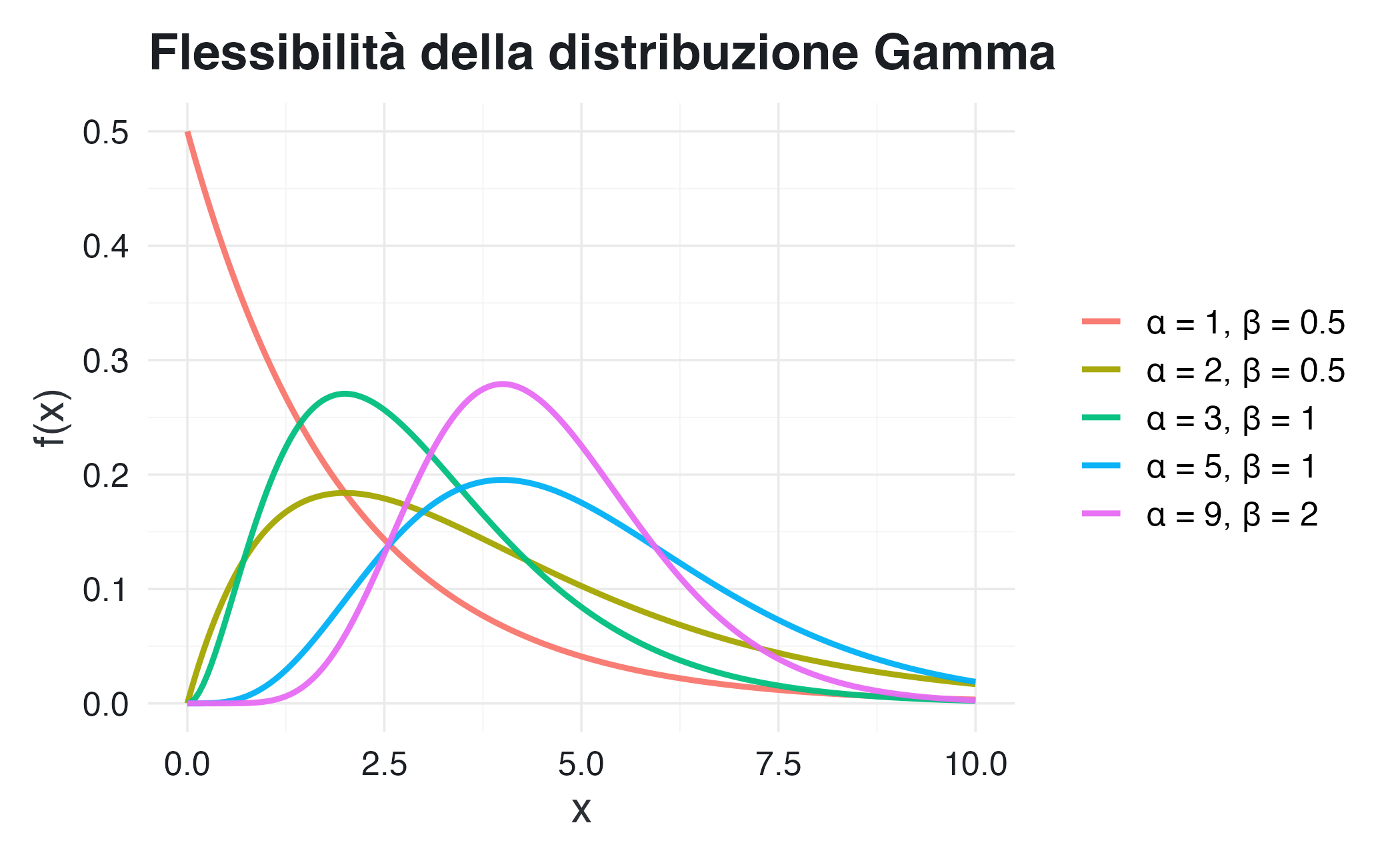 - Parametri: shape \(\alpha > 0\), rate \(\beta > 0\) (o scale \(\theta = 1/\beta\))