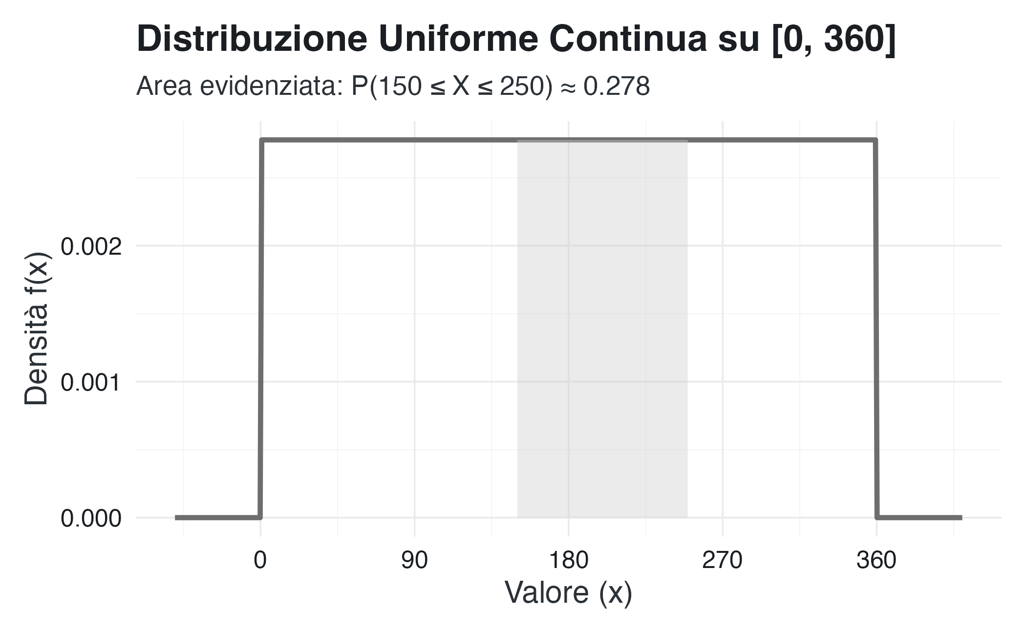 scale_x_continuous(breaks = seq(0, 360, by = 90))Legenda visiva: La linea continua rappresenta la funzione di densità costante f(x) = 1/360. L’area ombreggiata sotto la curva, delimitata tra x=150 e x=250, corrisponde alla probabilità dell’evento, visualizzando in modo diretto il principio “probabilità = area”.