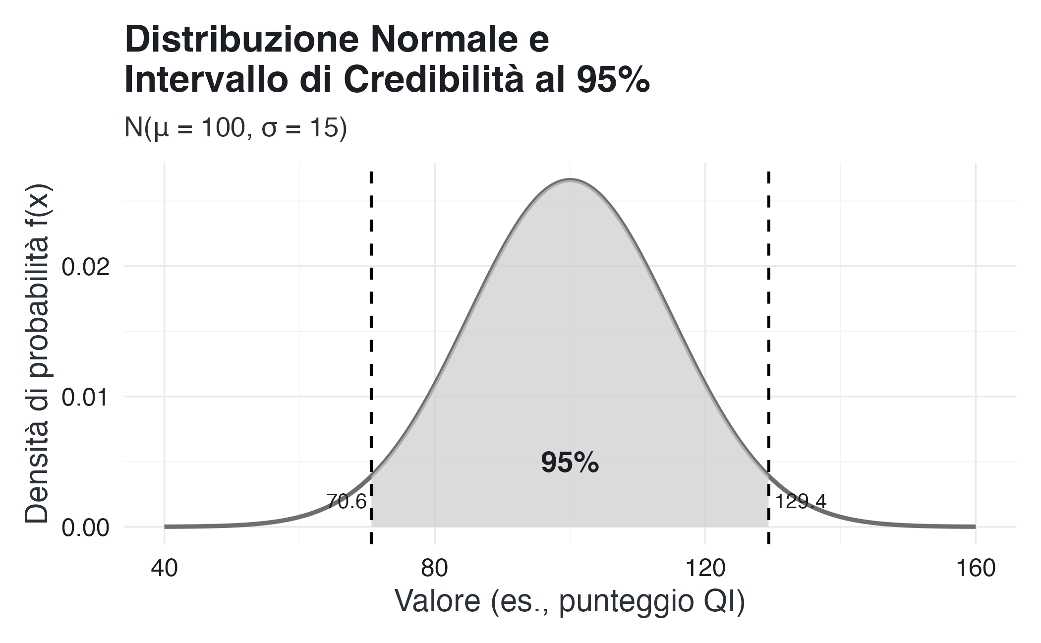 - Circa 95% della massa normale sta entro \(\mu \pm 1.96\sigma\)