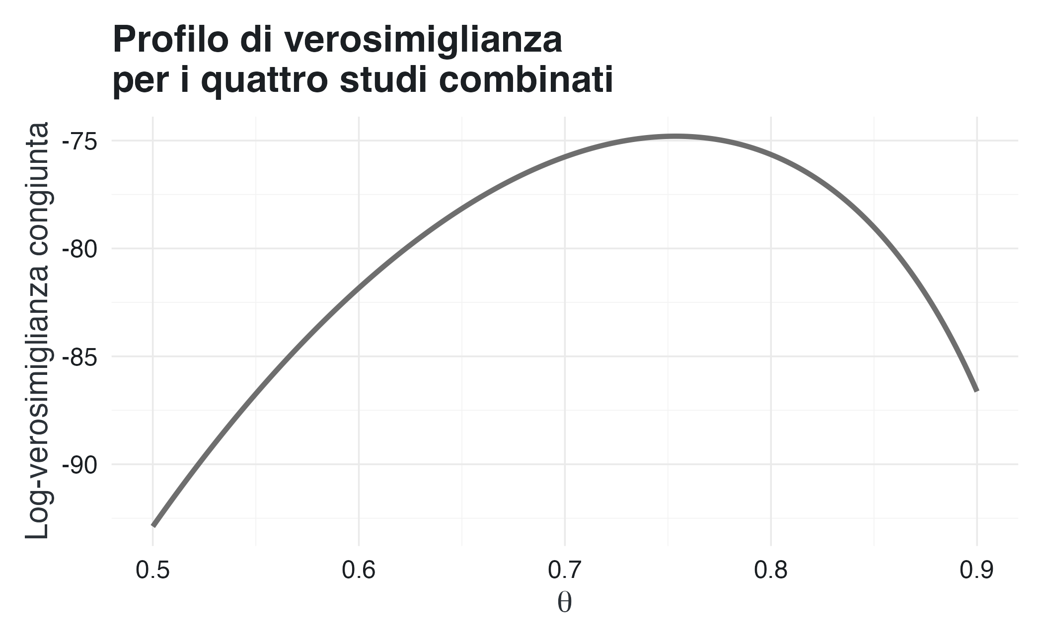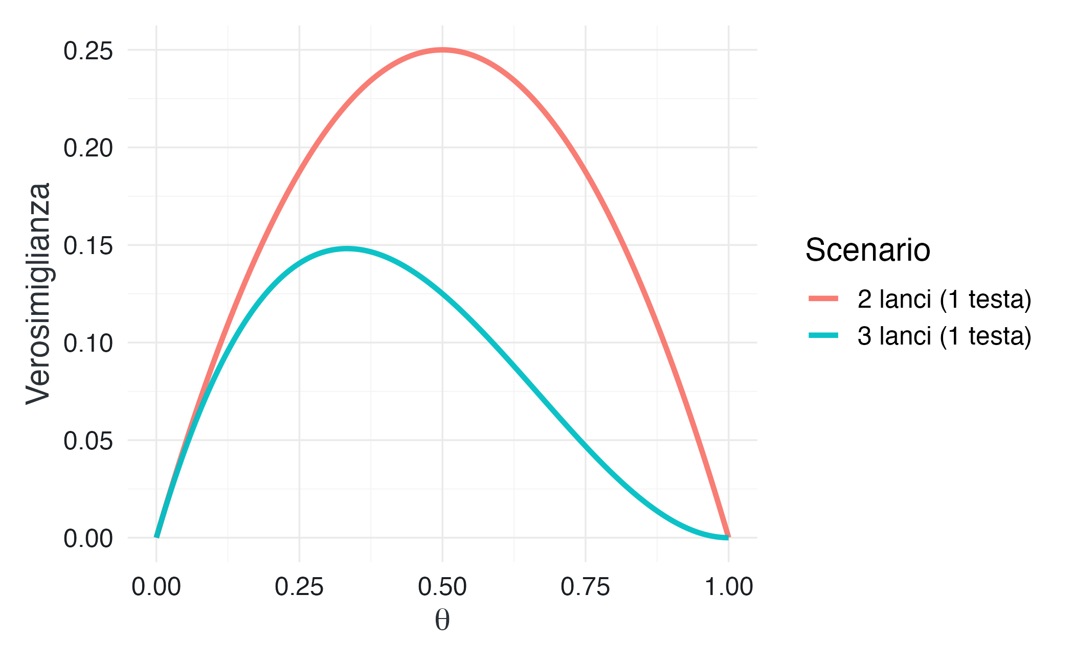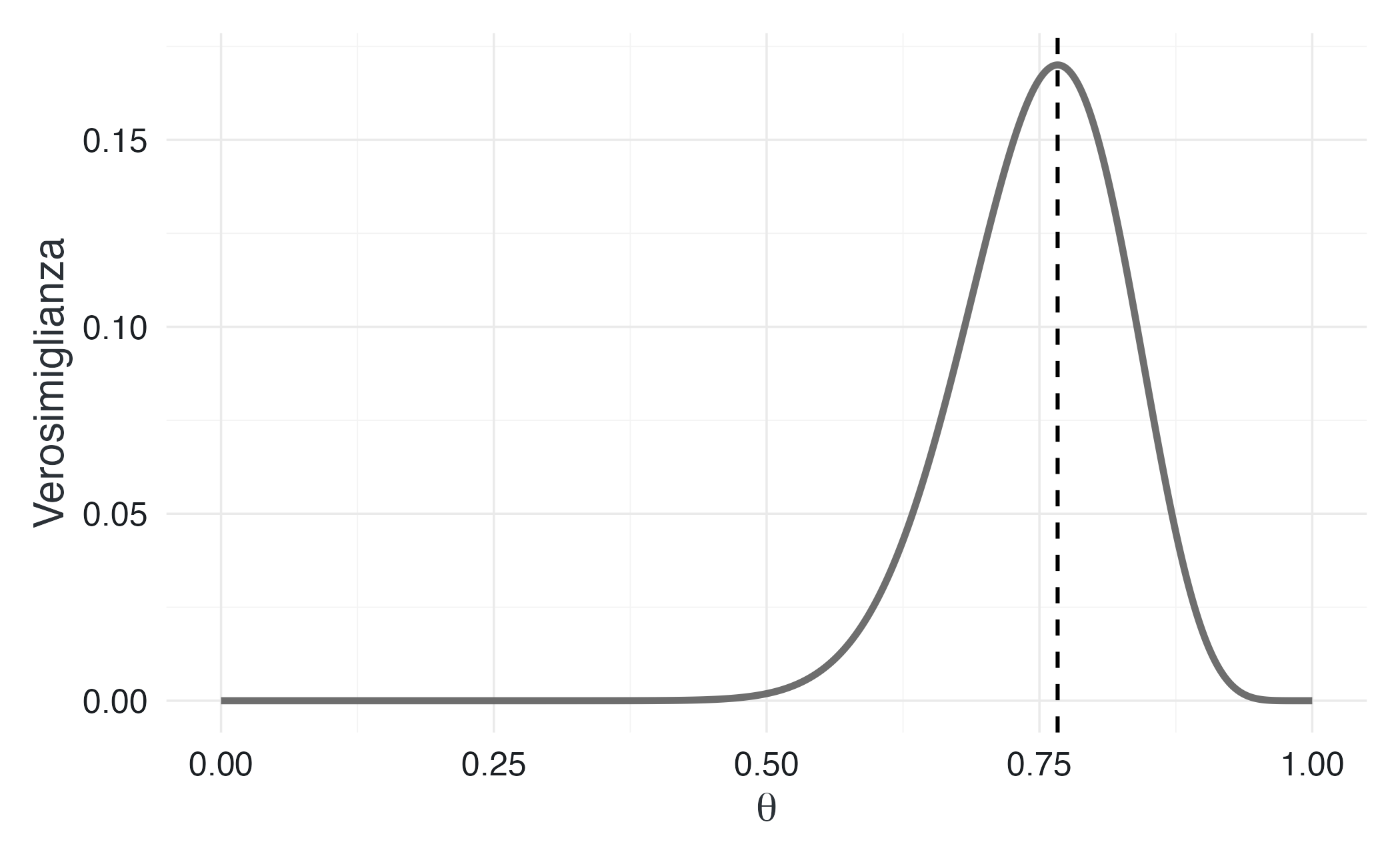 Il simbolo \(\propto\) indica che stiamo trascurando eventuali costanti moltiplicative che non dipendono da \(\theta\) e che quindi non influenzano il confronto tra valori diversi del parametro.