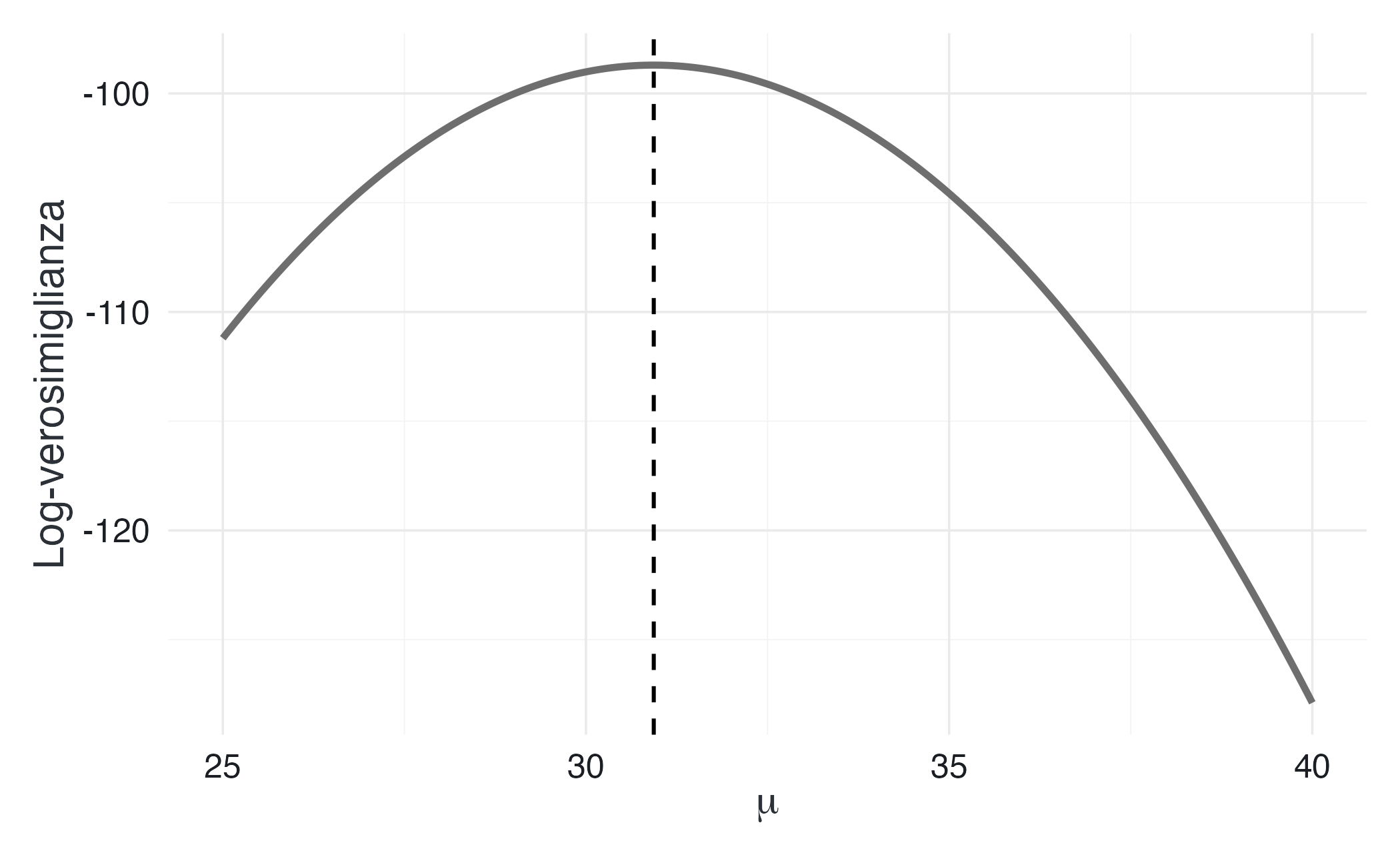 La log-verosimiglianza risolve questo problema trasformando il prodotto in una somma. Nel caso di osservazioni indipendenti \(y_1, \ldots, y_n\), si ha infatti: \[ \ell(\theta; y_1, \ldots, y_n) = \log L(\theta; y) = \sum_{i=1}^n \log f(y_i \mid \theta). \]