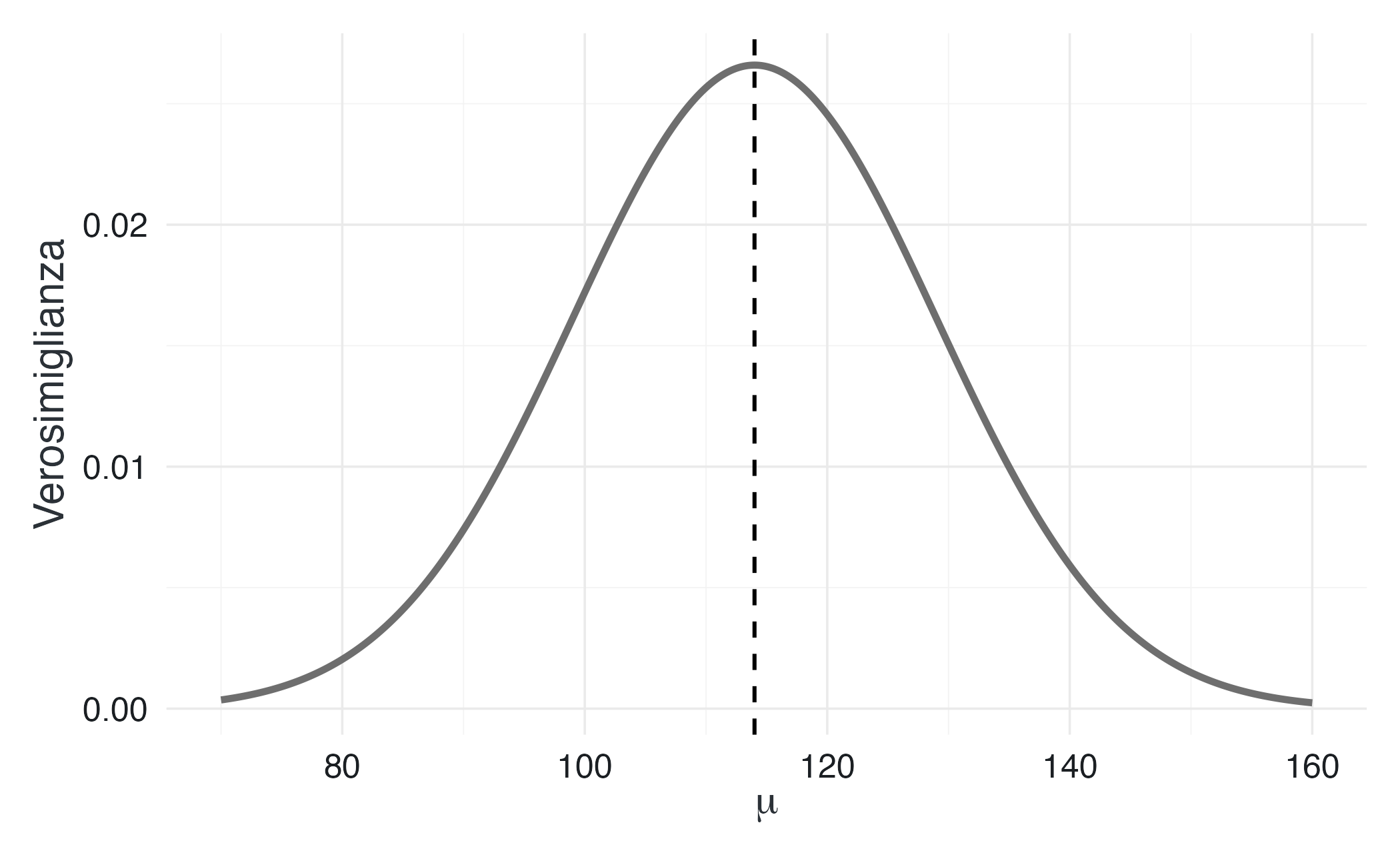 - Normale (varianza nota): \(L(\mu) \propto \exp\left(-\frac{1}{2\sigma^2}\sum(x_i-\mu)^2\right)\)