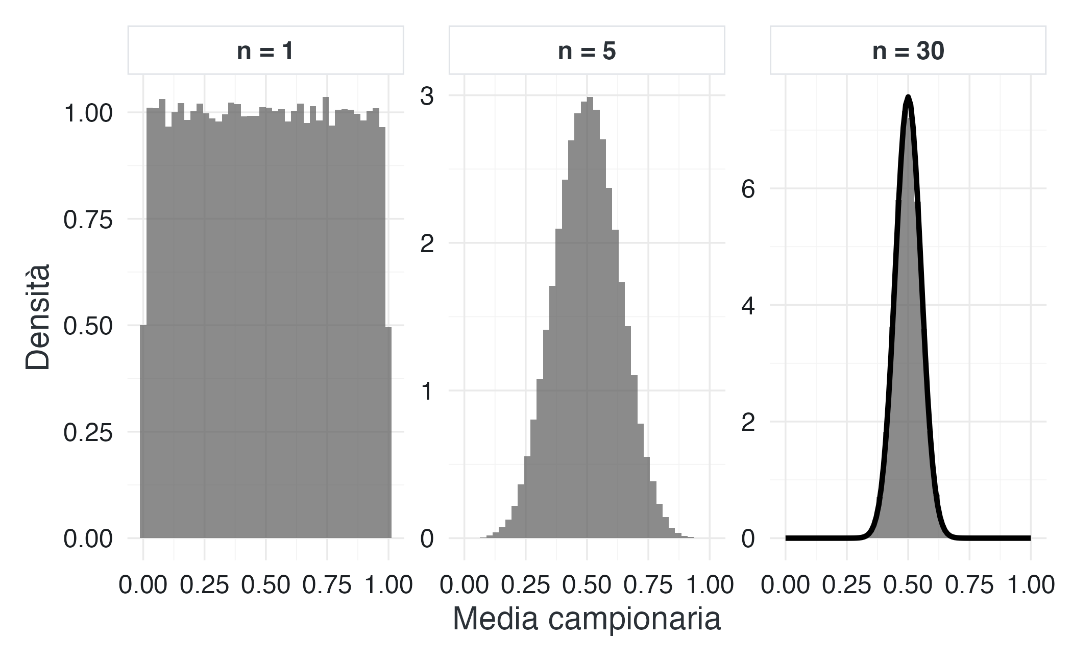 Infine, discuteremo il ruolo di due risultati fondamentali della teoria della probabilità, ovvero la Legge dei Grandi Numeri e il Teorema del Limite Centrale, che aiutano a comprendere il comportamento asintotico dell’inferenza bayesiana. Senza entrare in dimostrazioni formali, useremo questi teoremi per spiegare perché, al crescere dei dati, la distribuzione a posteriori tende a concentrarsi attorno al valore vero del parametro e perché, in molti contesti, essa può essere ben approssimata da una distribuzione gaussiana, indipendentemente dalla forma iniziale del prior.