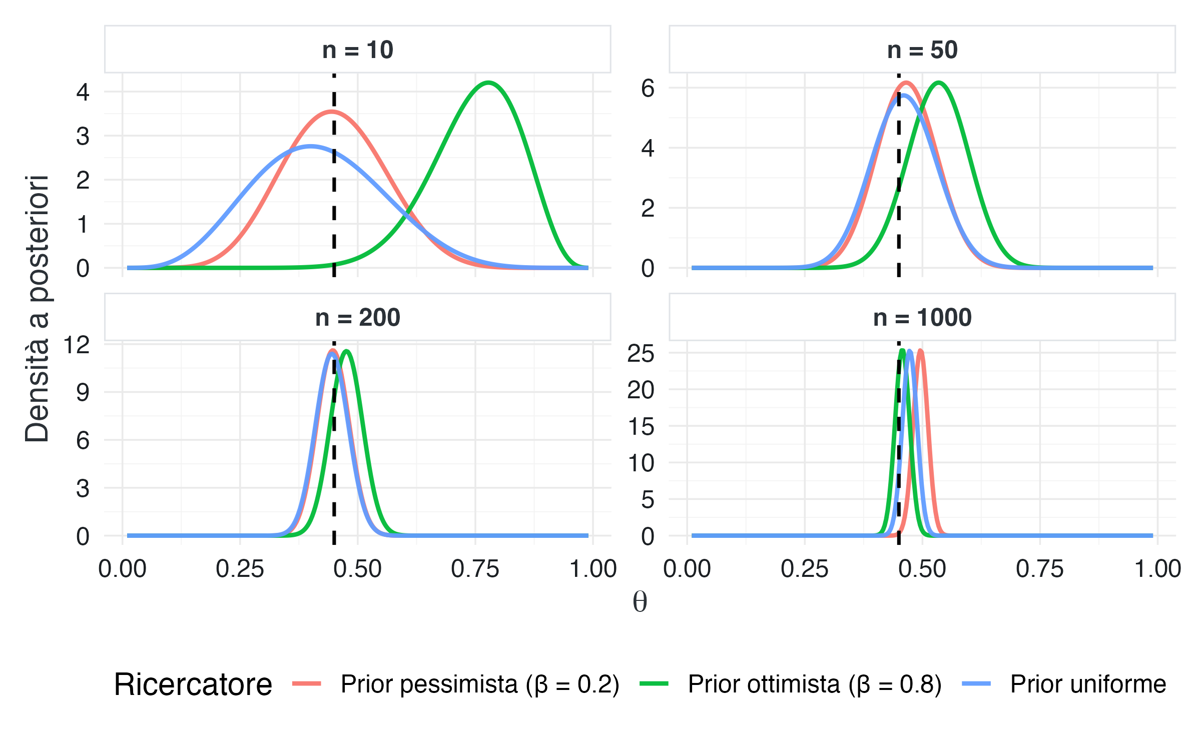 In questa prospettiva, l’aggiornamento bayesiano potrà essere reinterpretato come un processo di integrazione dell’informazione, in cui la verosimiglianza e la distribuzione a priori contribuiscono in modo complementare alla forma finale della distribuzione a posteriori. Questa lettura mette in evidenza come l’evidenza empirica e la conoscenza pregressa non siano in competizione, ma cooperino nella costruzione dell’inferenza.